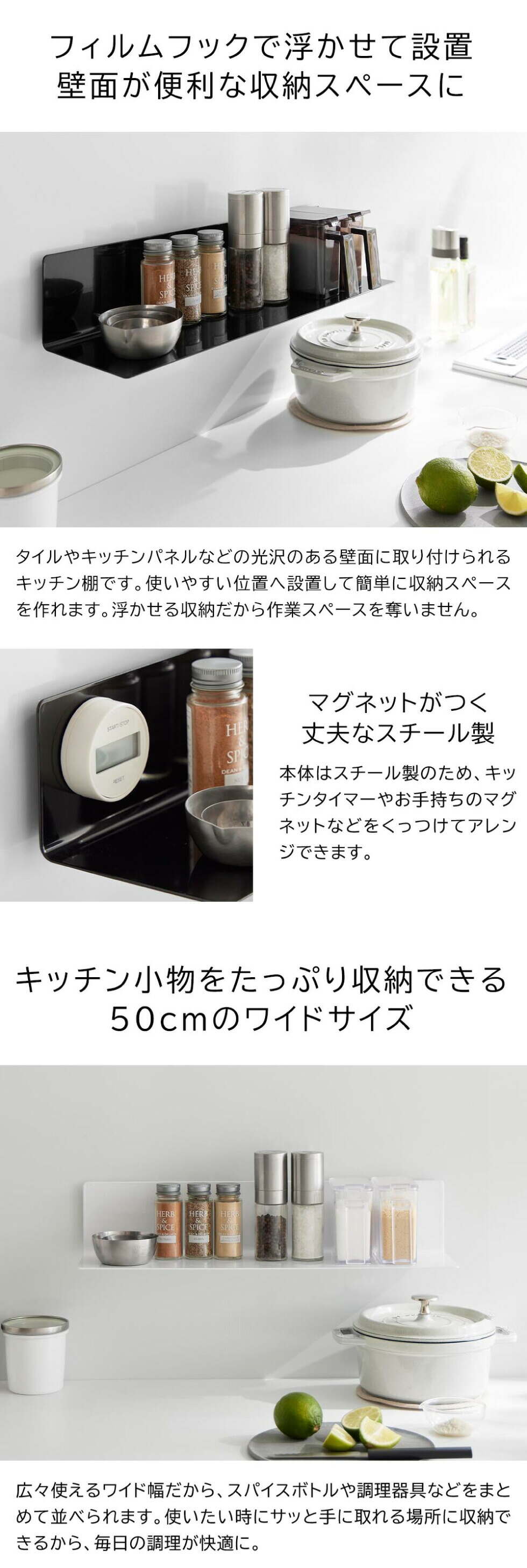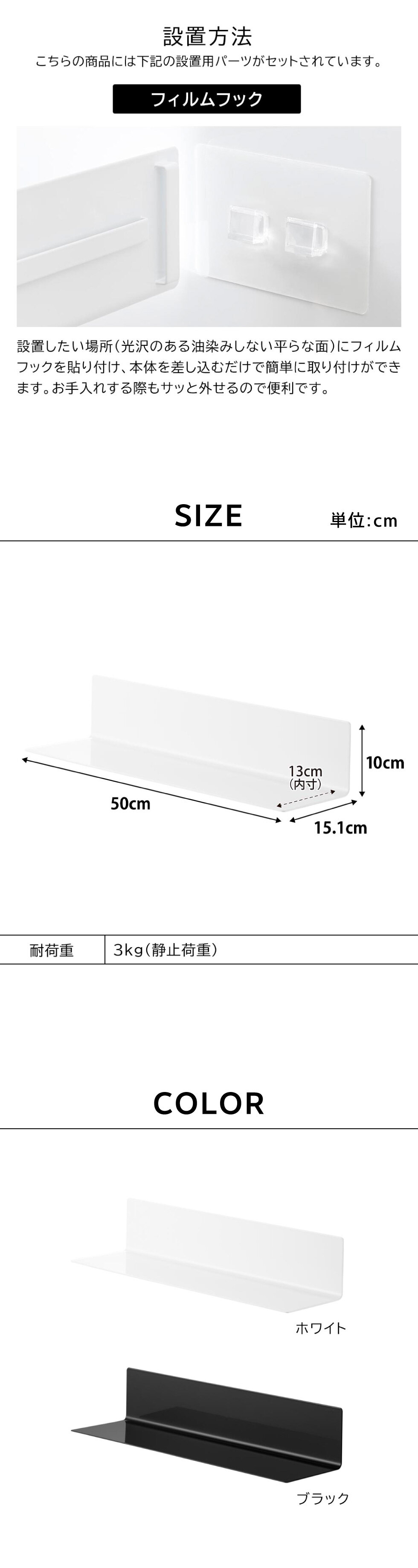 | サイズ/寸法 | 商品サイズ: 本体:W50×D15.1×H10cm、フィルムフック接着面:W15×H9cm(1つあたり) 内寸サイズ: 棚板:D13cm |