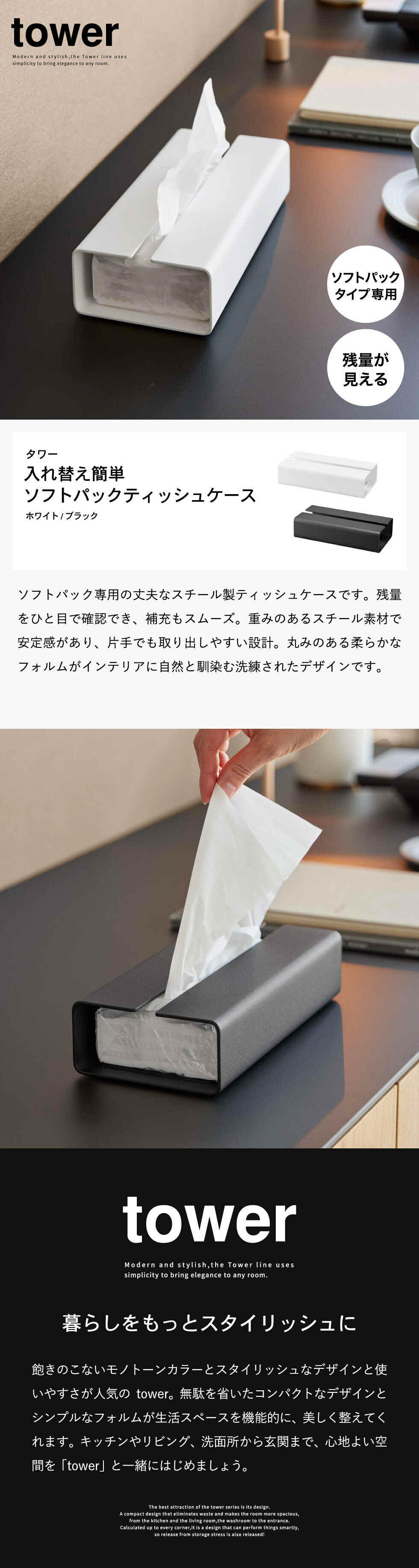 tower 入れ替え簡単ソフトパックティッシュケース タワー 山崎実業 10450 10451 / ブラック