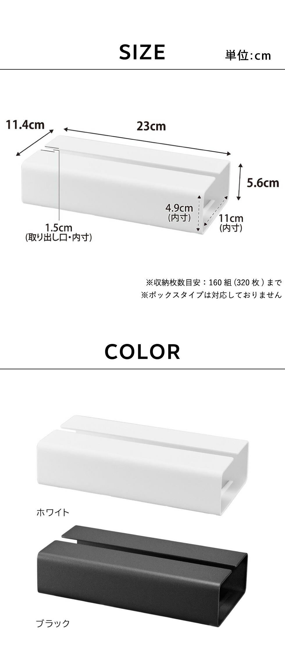 | サイズ/寸法 | 商品サイズ: W23×D11.4×H5.6cm 内寸サイズ: 収納部:W23×D11×H4.9cm 取り出し口:W23×D1.5cm |