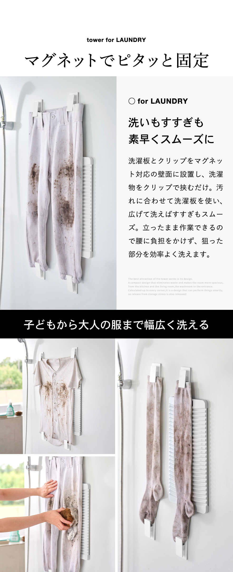 | 原材料/素材/材質 | 洗濯板:ポリプロピレン ネオジムマグネット 緩衝材:シリコーンゴム クリップ×4:ABS樹脂 マグネット 滑り止め:シリコーンゴム バネ:鋼 |