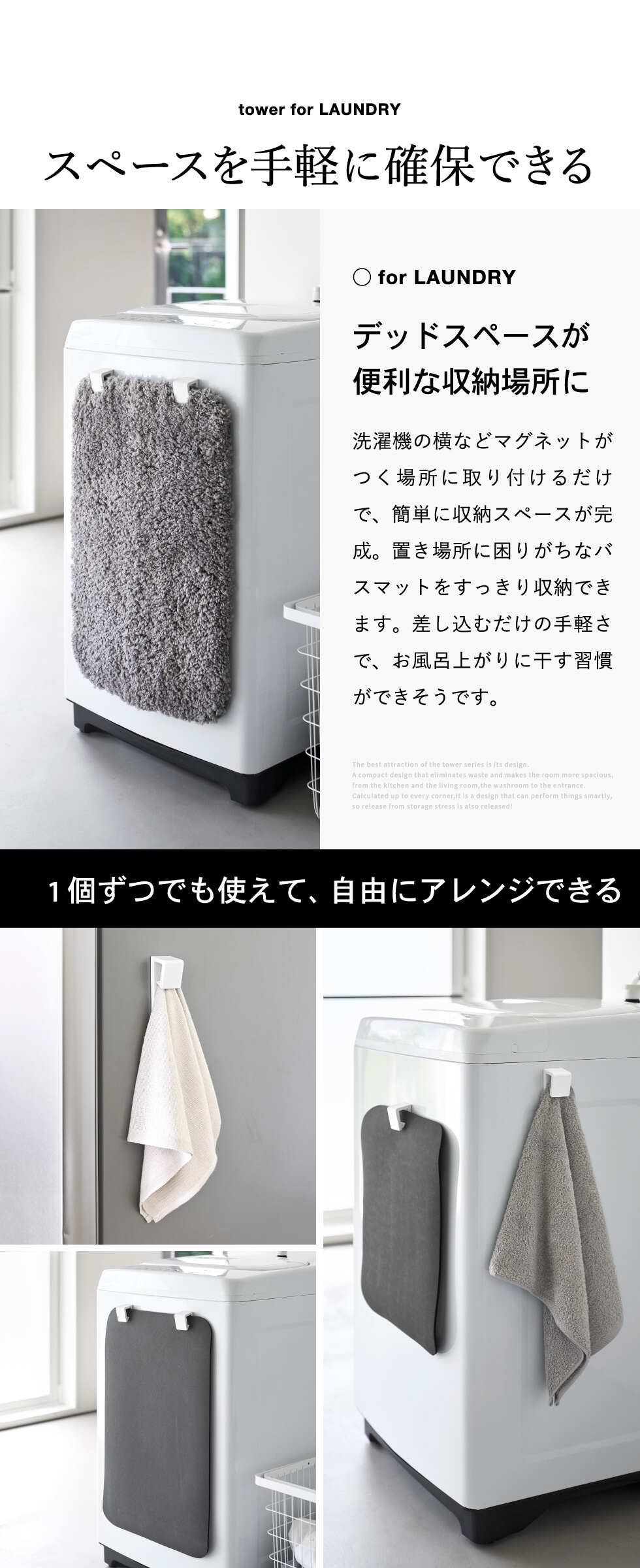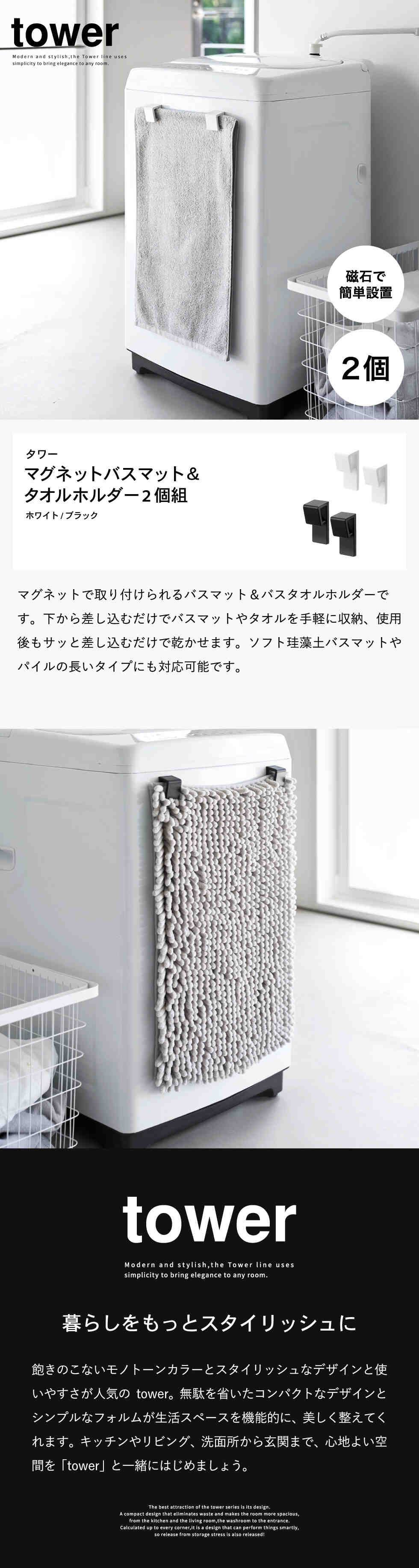 tower マグネットバスマット&タオルホルダー タワー 2個組 山崎実業 10612 10613 / ブラック