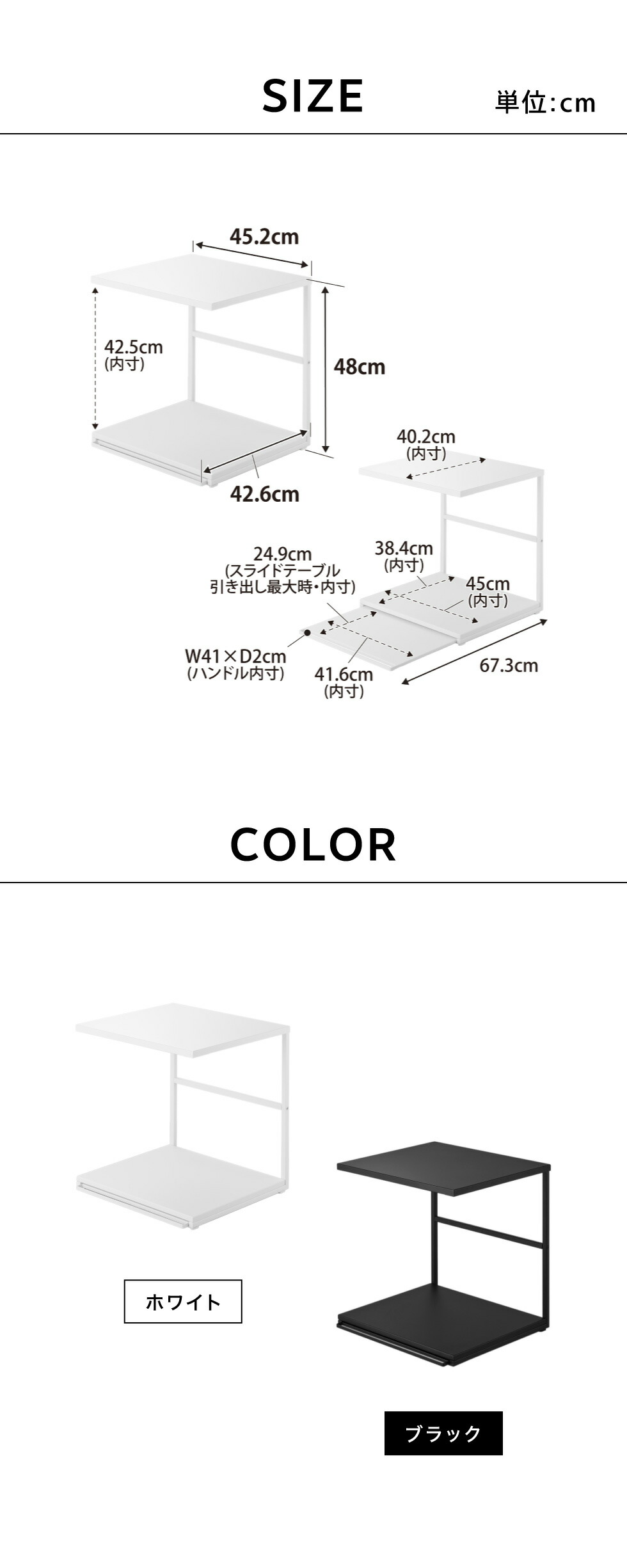 | サイズ/寸法 | 商品サイズ:約 W45.2×D42.6~67.3×H48cm 内寸サイズ:約 上棚:W45.2×D40.2cm 置き台:W45×D38.4×H42.5cm スライドテーブル:W41.6×D24.9cm(引き出し時最大) |