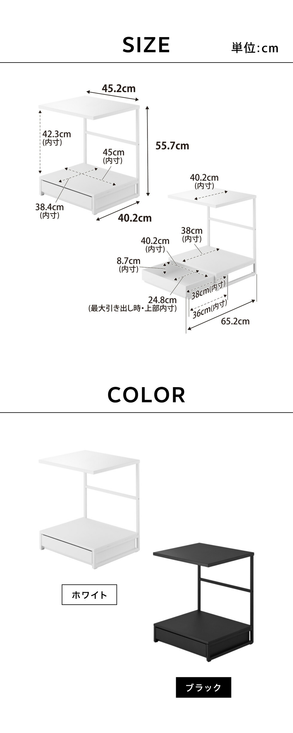 | サイズ/寸法 | 商品サイズ:約 W45.2×D40.2~65.2×H55.7cm 内寸サイズ:約 上棚:W45.2×D40.2cm 置き台:W45×D38.4×H42.3cm 引き出し:W40.2×D38×H8.7cm(開口部最大D24.8cm) |
