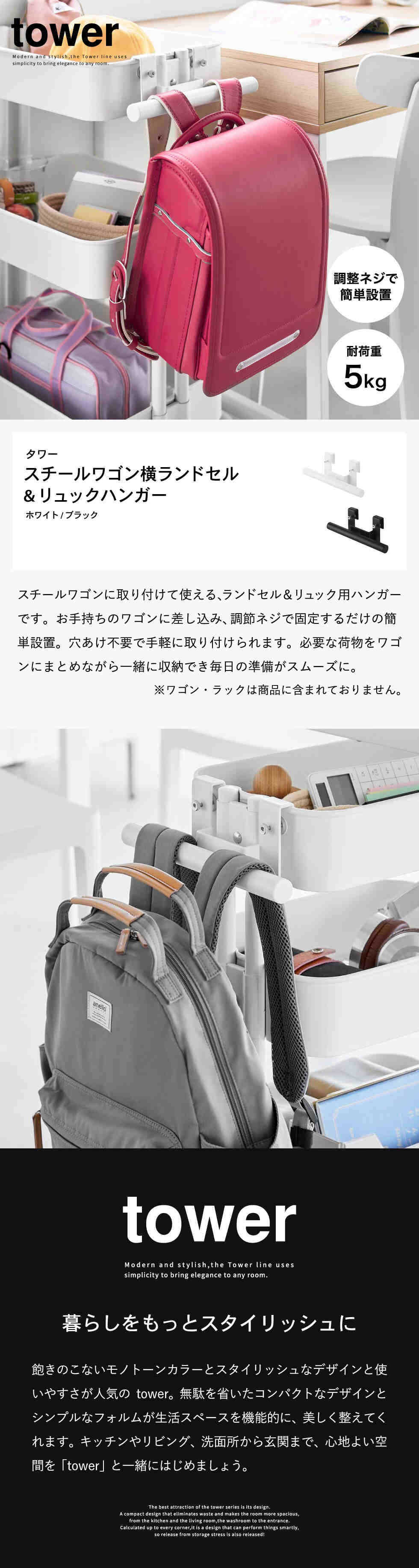 tower スチールワゴン横ランドセル&リュックハンガー タワー 山崎実業 10771 10772 / ブラック