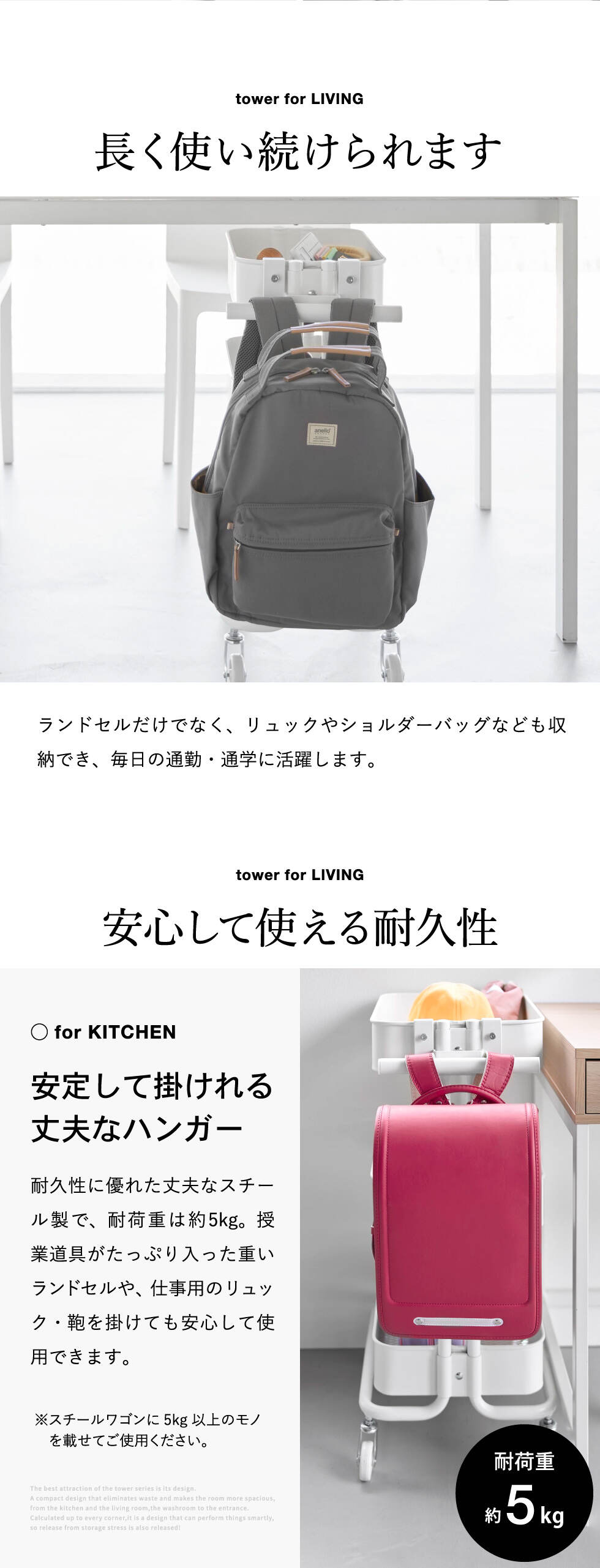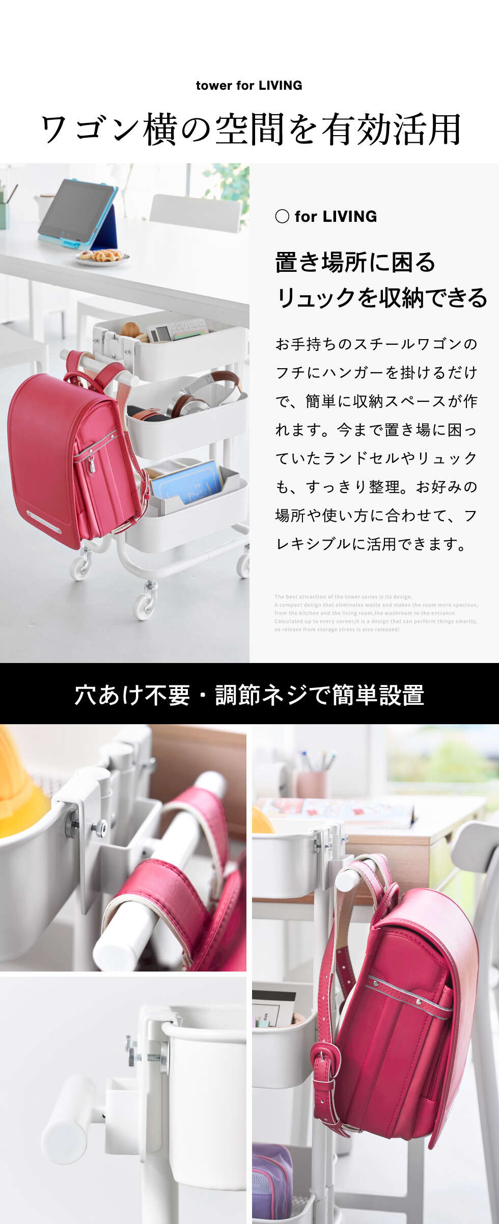 | その他詳細 1 | 付属品:六角レンチ 耐荷重:5kg(静止荷重) ※必ずスチールワゴンに物(重さの目安:5kg以上)を載せてご使用ください。 取り付け可能なスチールワゴンのバスケット バスケット(短辺側):幅(直線部分)15cm以上・厚さ8mm以内・高さ(深さ)4cm以上 支柱:幅8.2cm以内・奥行(バスケット内側から)3.3cm以内 ※ランドセルやワゴンのサイズ・形状・仕様によっては、収納・取り付けができない場合があります。 |