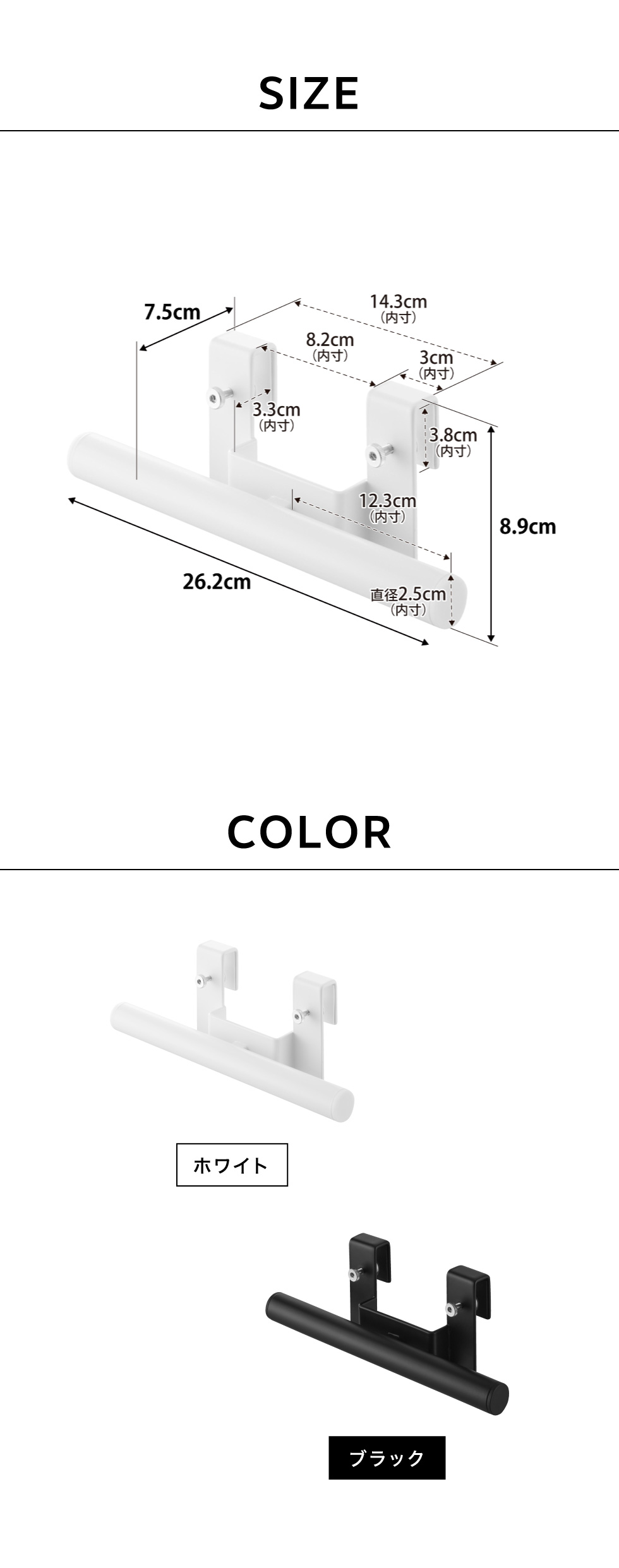 | サイズ/寸法 | 商品サイズ: W26.2×D7.5×H8.9cm 内寸サイズ: ハンガー部:直径2.5cm・W12.3cm(片側あたり) |