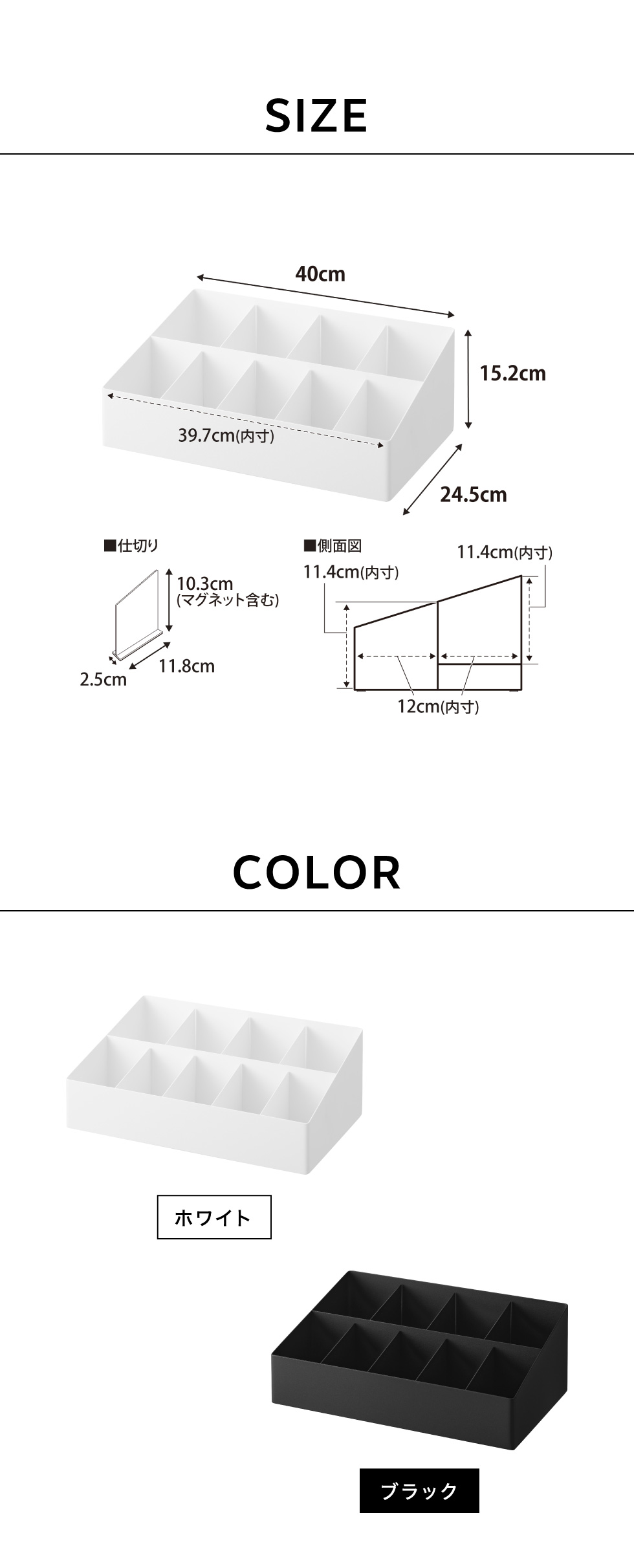 | サイズ/寸法 | 商品サイズ: W40×D24.5×H15.2cm 内寸サイズ: 収納部1つあたり:W39.7×D12×H11.4cm 仕切り1つあたり:W2.5×D11.8×H10.3cm |