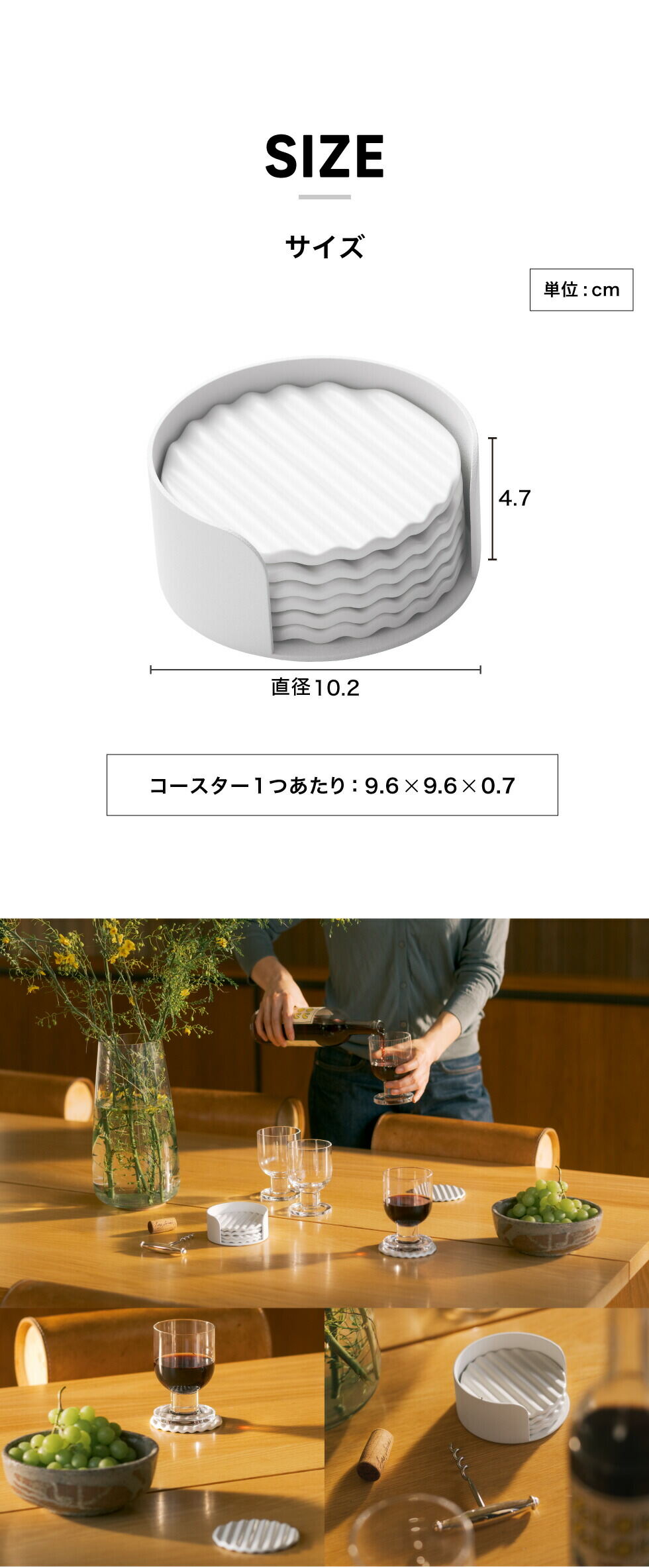 | サイズ/寸法 | 約 W10.2×D10.2×H4.7cm、コースター1つあたり:W9.6×D9.6×H0.7cm |