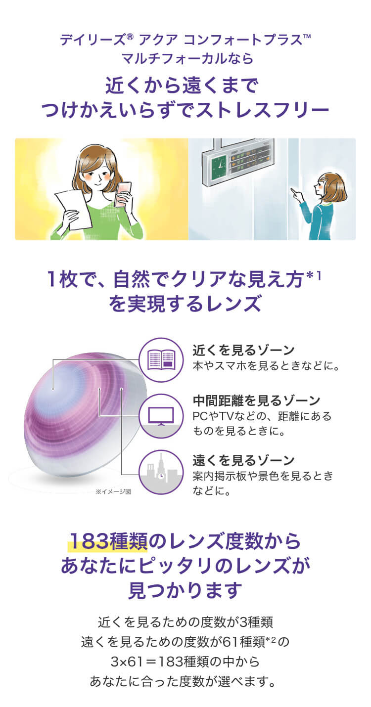 | その他詳細 1 | ■装用期間:1日使い捨て ■装用 :終日装用 ■BC:8.7mm ■DIA:14.0mm ■度数 +5.00~+0.00(0.25刻み) -0.25~-10.00(0.25刻み) ■加入度数 LO/MED/HI ■含水率:69% |