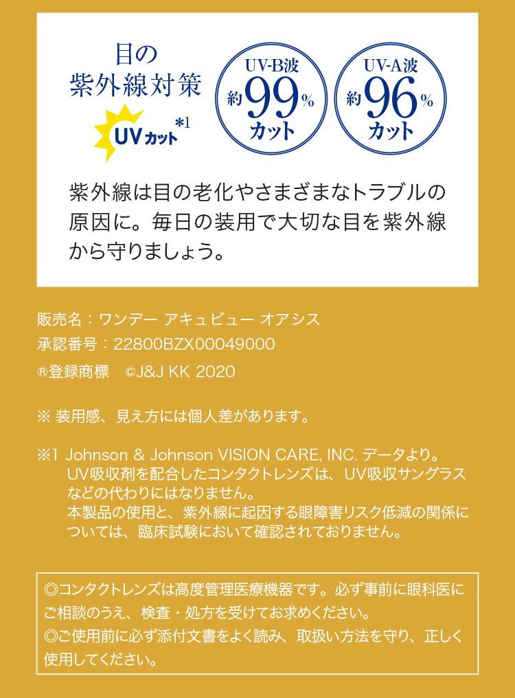 | 注意事項/留意事項 | コンタクトレンズは高度管理医療機器です。取り扱い方法を守り正しくご使用下さい。 |