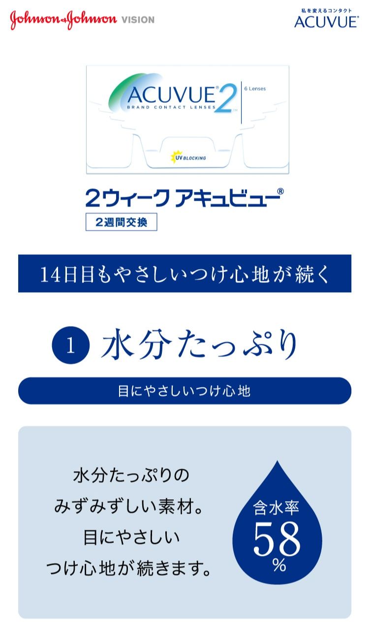 | その他詳細 1 | ■装用期間:2週間使い捨て ■装用 :終日装用 ■BC:8.3mm/8.7mm ■DIA:14.0mm ■度数 -0.50~-6.00(0.25刻み) -6.50~-12.00(0.50刻み) +0.50~+5.00(0.25刻み) ■含水率:58% |