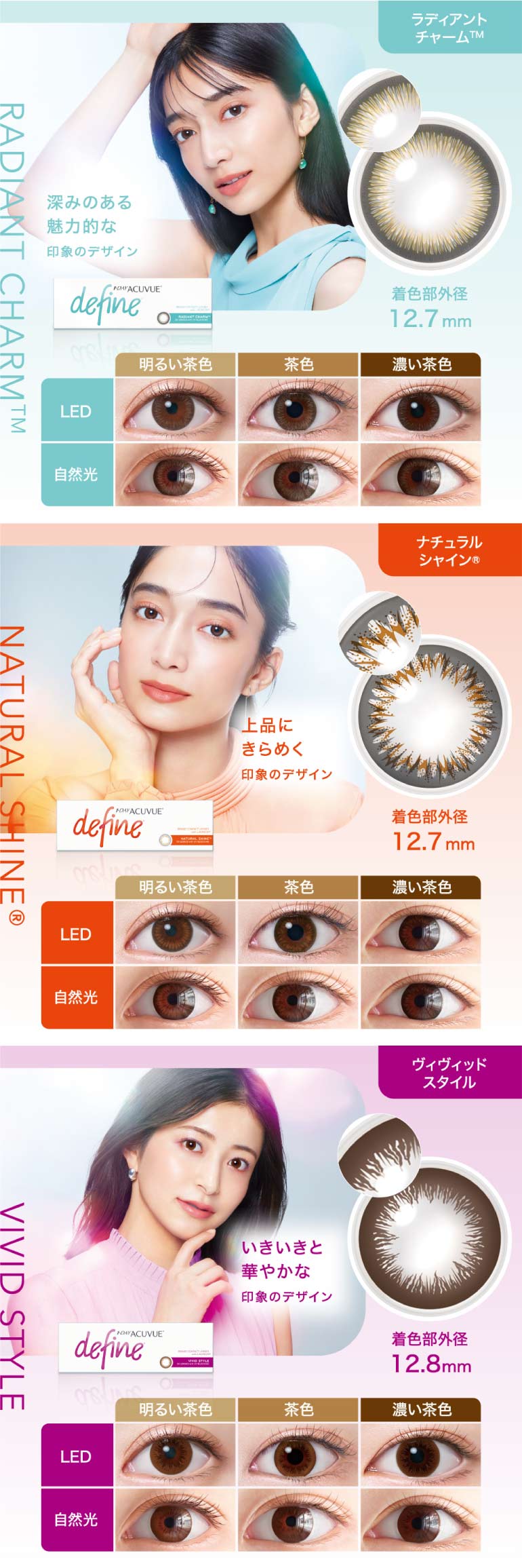 | その他詳細 1 | ■装用期間:1日使い捨て ■装用 :終日装用 ■BC:8.5mm ■DIA:14.2mm ■度数 -0.50~-6.00(0.25刻み) -6.50~-9.00(0.50刻み) ±0.00 ■着色直径 ヴィヴィッドスタイル、シアードリーム、シアーアリュール:12.8mm ラディアントシック、ラディアントブライト、ラディアントチャーム、ナチュラルシャイン:12.7mm アクセントスタイル:12.5mm ■含水率:58% |