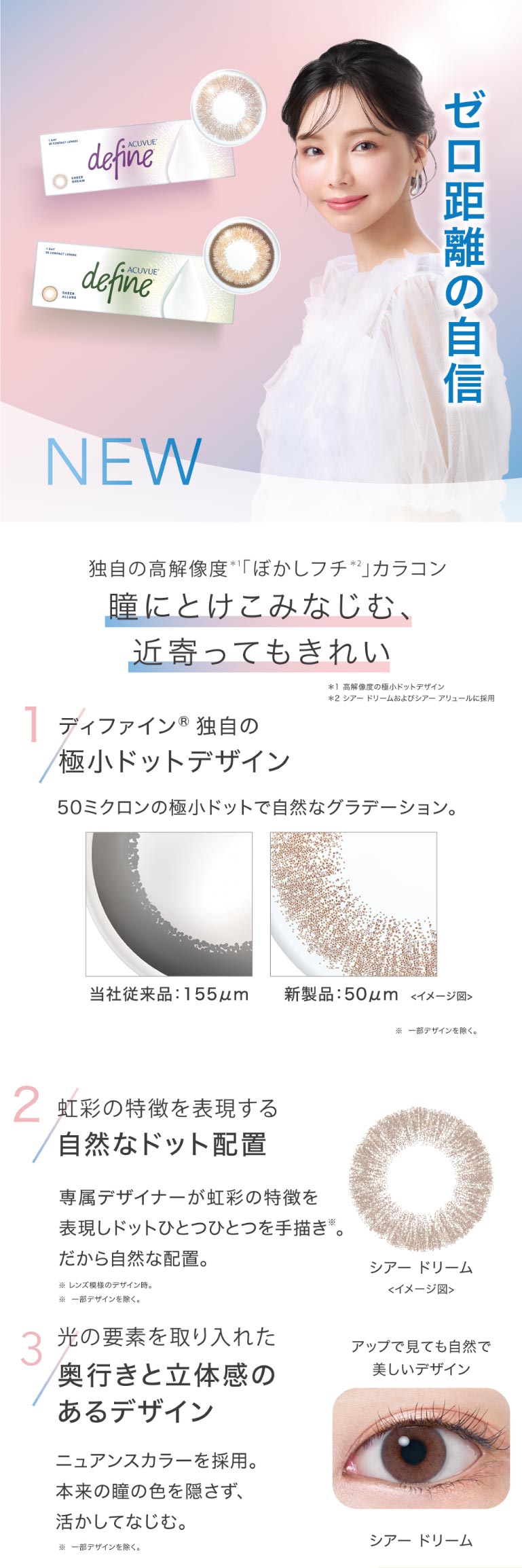 | その他詳細 1 | ■装用期間:1日使い捨て ■装用 :終日装用 ■BC:8.5mm ■DIA:14.2mm ■度数 -0.50~-6.00(0.25刻み) -6.50~-9.00(0.50刻み) ±0.00 ■着色直径 ヴィヴィッドスタイル、シアードリーム、シアーアリュール:12.8mm ラディアントシック、ラディアントブライト、ラディアントチャーム、ナチュラルシャイン:12.7mm アクセントスタイル:12.5mm ■含水率:58% |