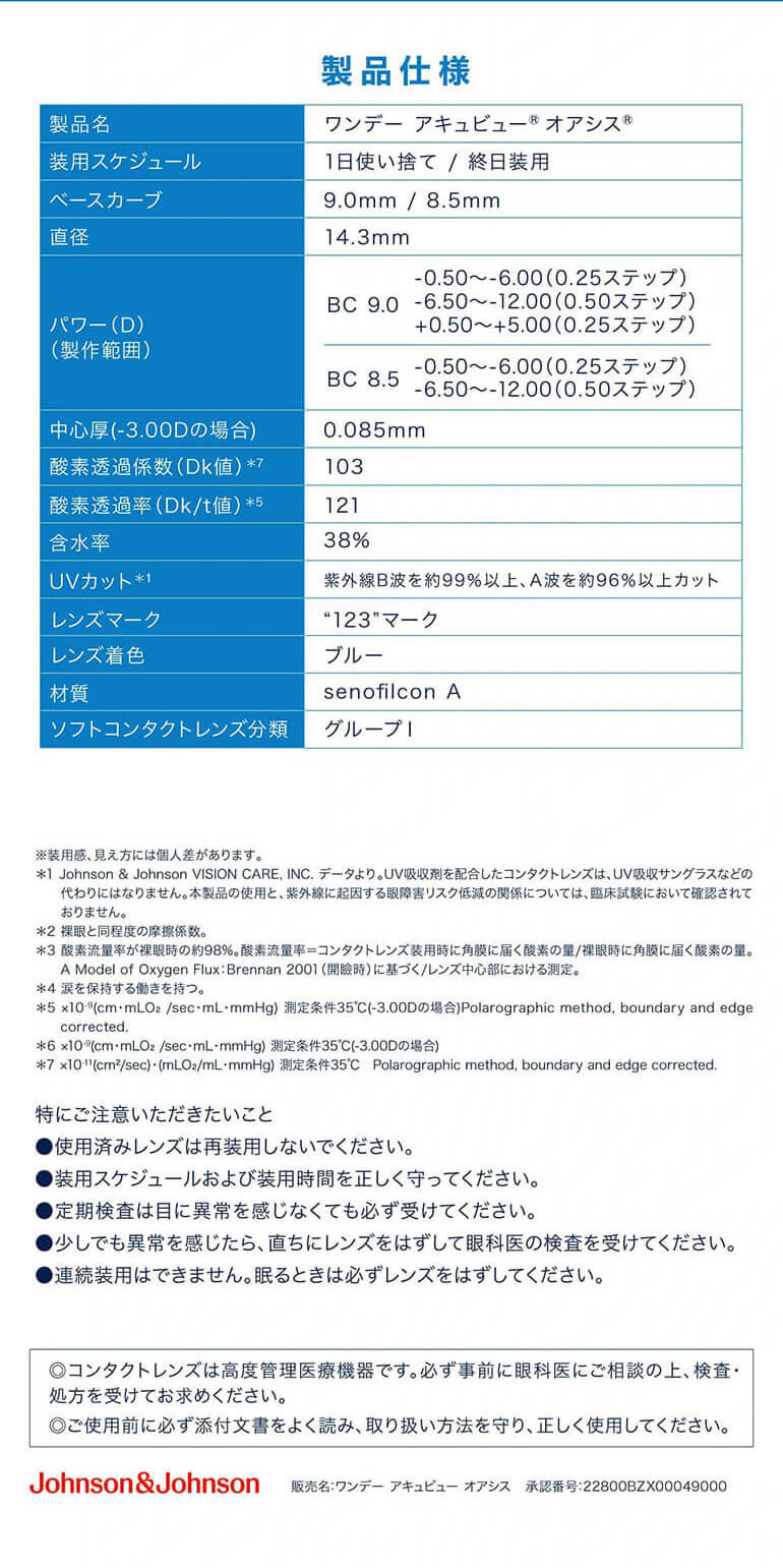| 注意事項/留意事項 | コンタクトレンズは高度管理医療機器です。取り扱い方法を守り正しくご使用下さい。 |