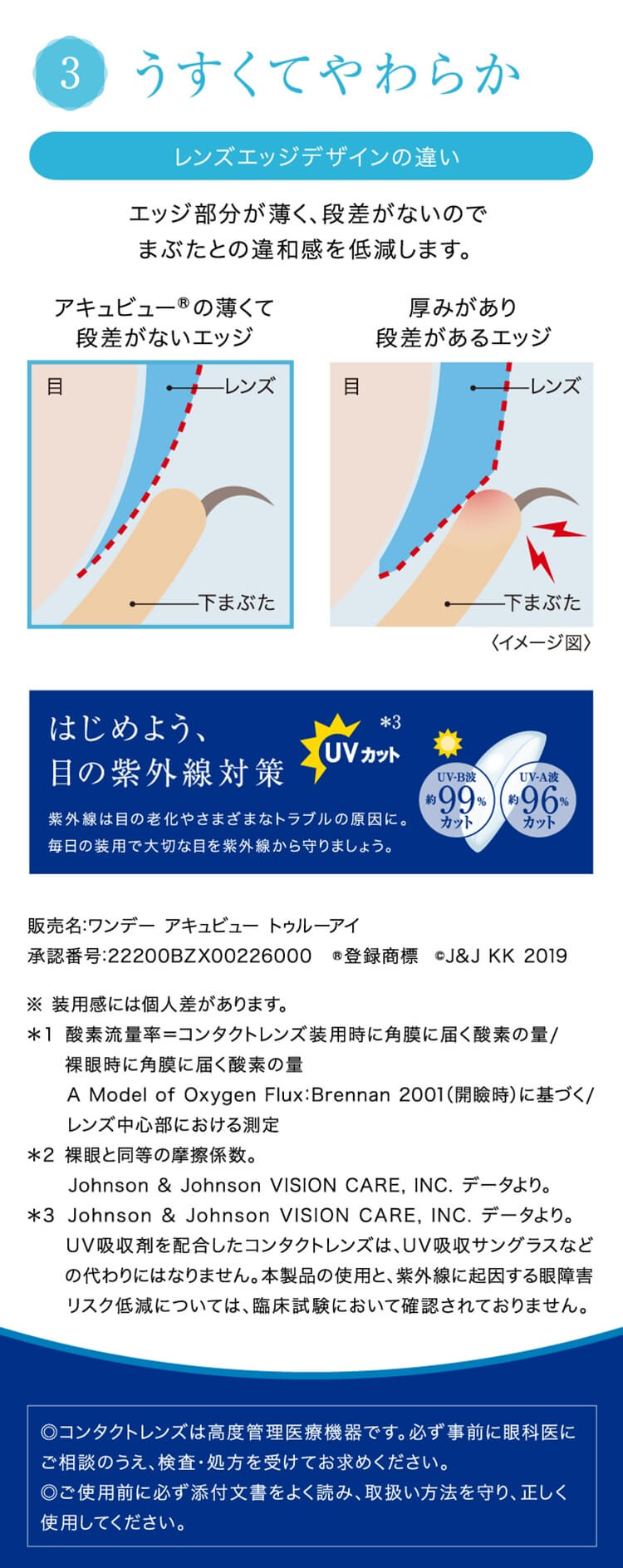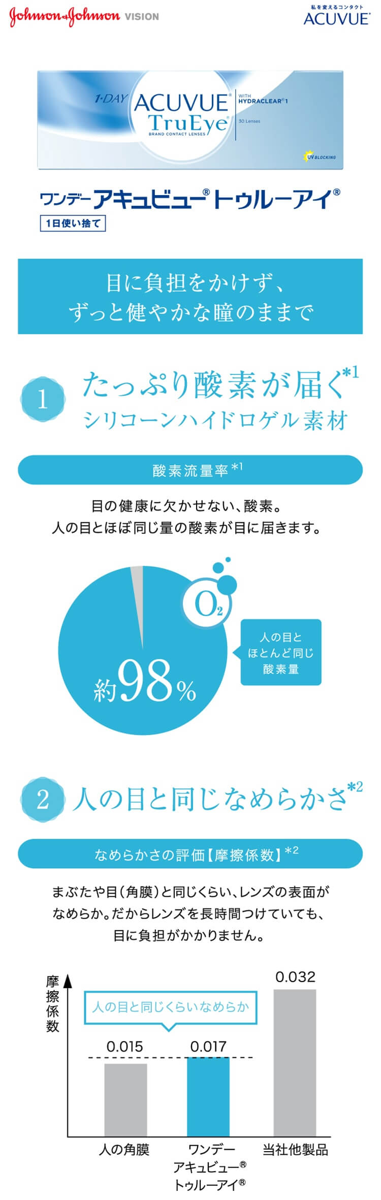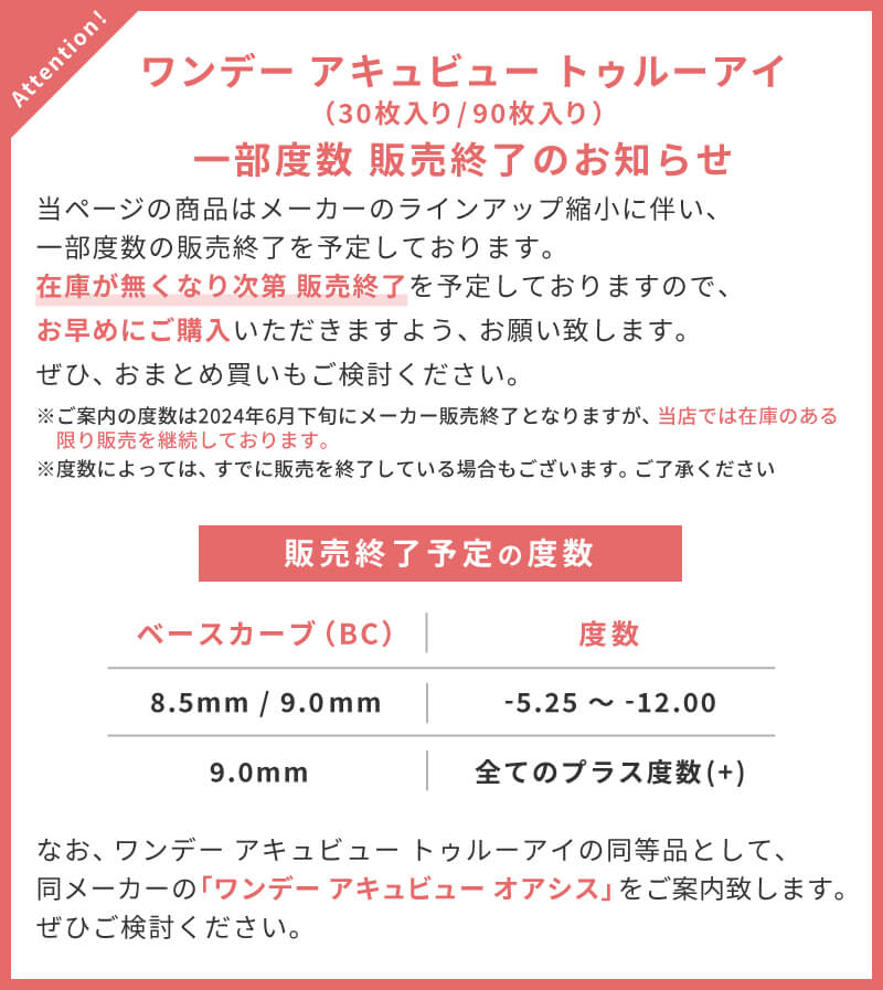 | その他詳細 1 | ■装用期間:1日使い捨て ■装用 :終日装用 ■BC:8.5mm/9.0mm ■DIA:14.2mm ■度数 -0.50~-6.00(0.25刻み) -6.50~-12.00(0.50刻み) +0.50~+5.00(0.25刻み)(BC9.0のみ) ※トゥルーアイの-5.25~-12.00と全てのプラス度数(遠視度数)は2024年6月下旬に販売終了を予定しております。 後継品としてワンデーアキュビューオアシスをご検討ください。 ■含水率:46% |