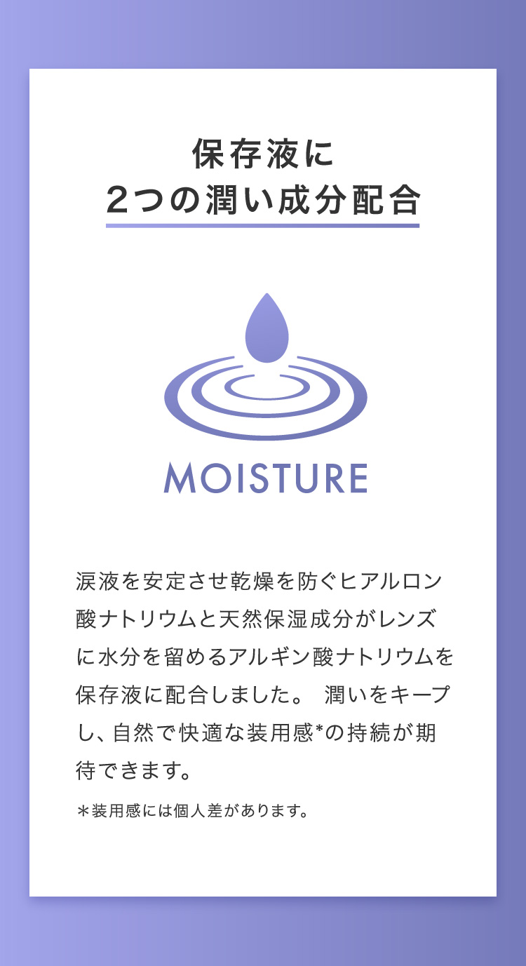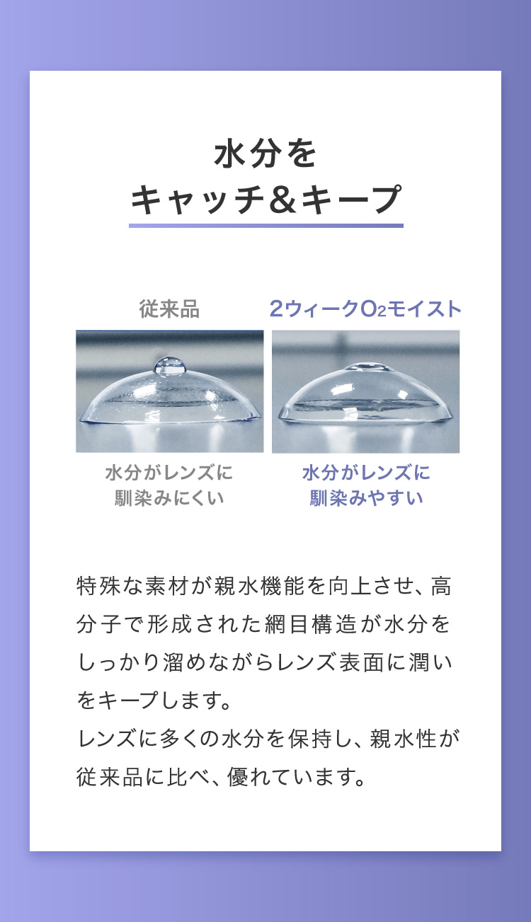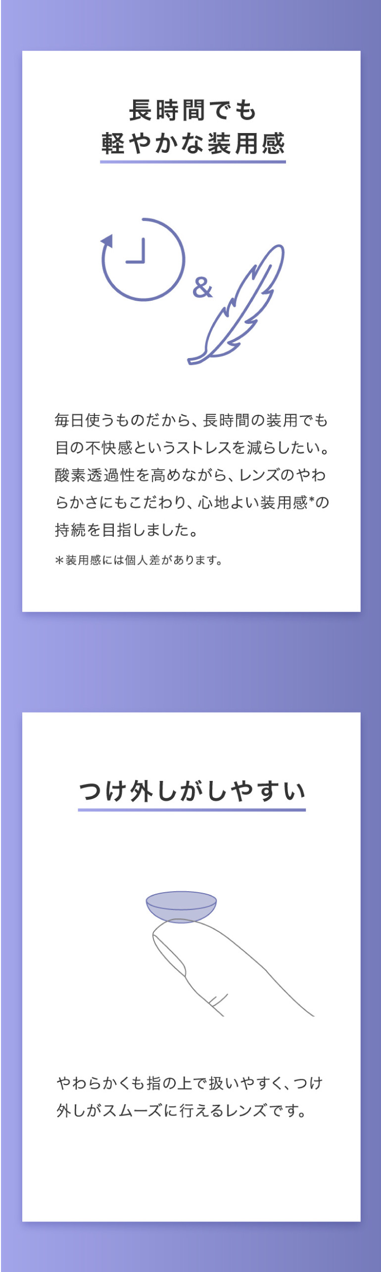 | その他詳細 1 | ■装用期間:2週間交換タイプ ■装用 :終日装用 ■BC:8.7mm ■DIA:14.0mm ■度数 -0.50D~-6.00D(0.25刻み) -6.00D~-10.00D(0.50刻み) ■含水率:47% |