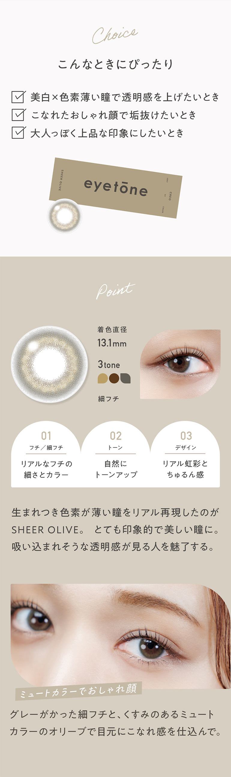 | その他詳細 1 | ■装用期間:1日使い捨て ■装用 :終日装用 ■BC:8.5mm ■DIA:14.2mm ■度数 0.00(度なし) -0.50~-6.00(0.25刻み) -6.50~-8.00(0.50刻み) ■着色直径 サンドベージュ:13.1mm シアーオリーブ:13.1mm ヌードトープ:13.1mm ■含水率:58% |