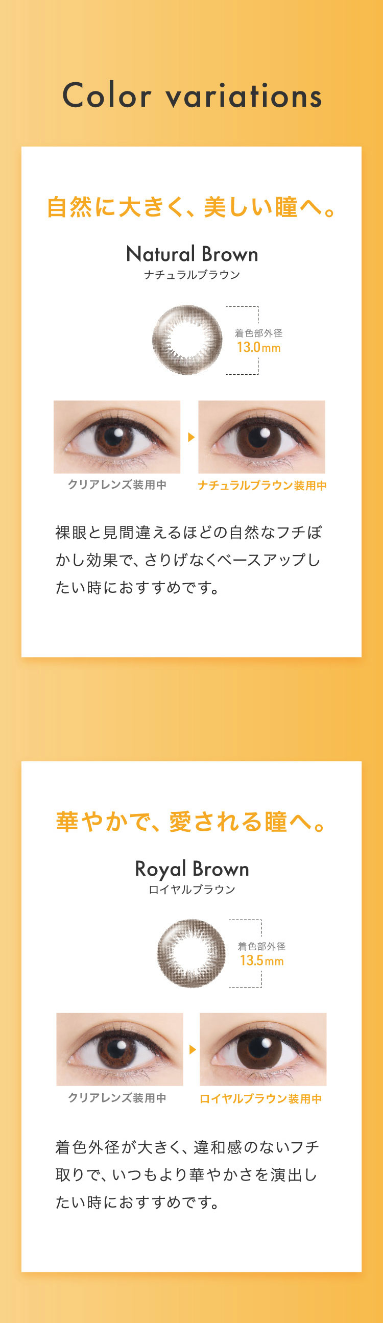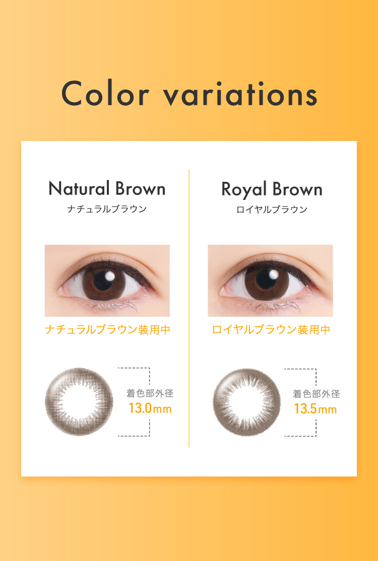 | その他詳細 1 | ■装用期間:1日使い捨て ■装用 :終日装用 ■BC:8.5mm ■DIA:14.2mm ■度数 0.00(度なし) -0.50~-6.00(0.25刻み) -6.50~-8.00(0.50刻み) ■着色直径 ナチュラルブラウン 13.0mm ロイヤルブラウン 13.5mm ■含水率:58% |