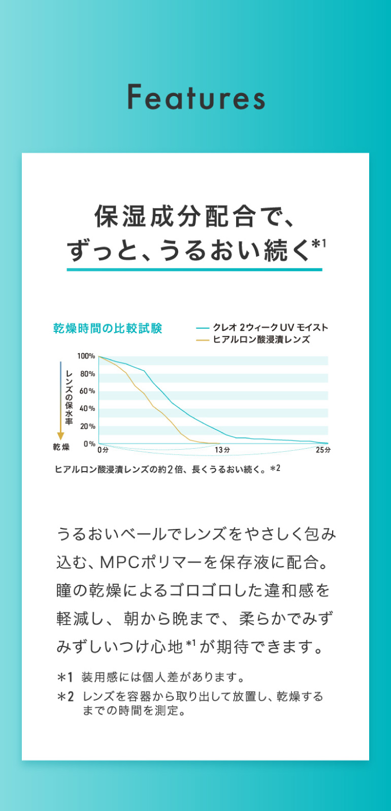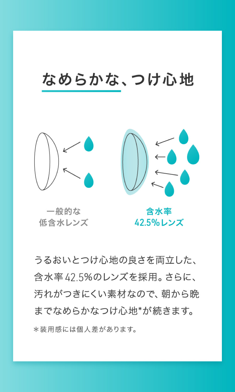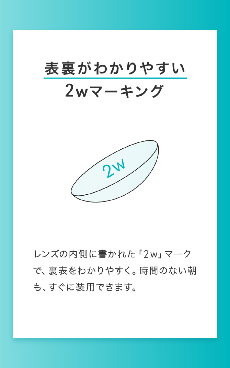 | その他詳細 1 | ■装用期間:2週間交換タイプ ■装用 :終日装用 ■BC:8.7mm ■DIA:14.0mm ■度数 -0.50D~-6.00D(0.25刻み) -6.50D~-10.00D(0.50刻み) ■含水率:42.5% |