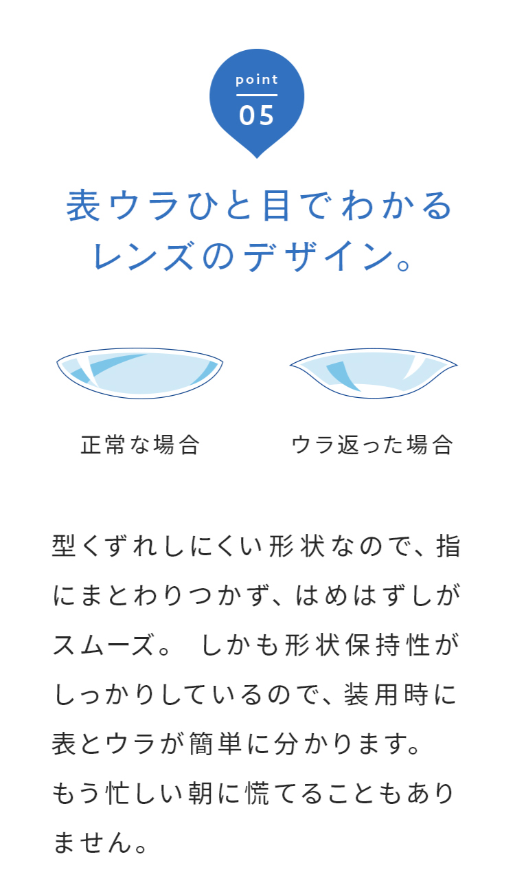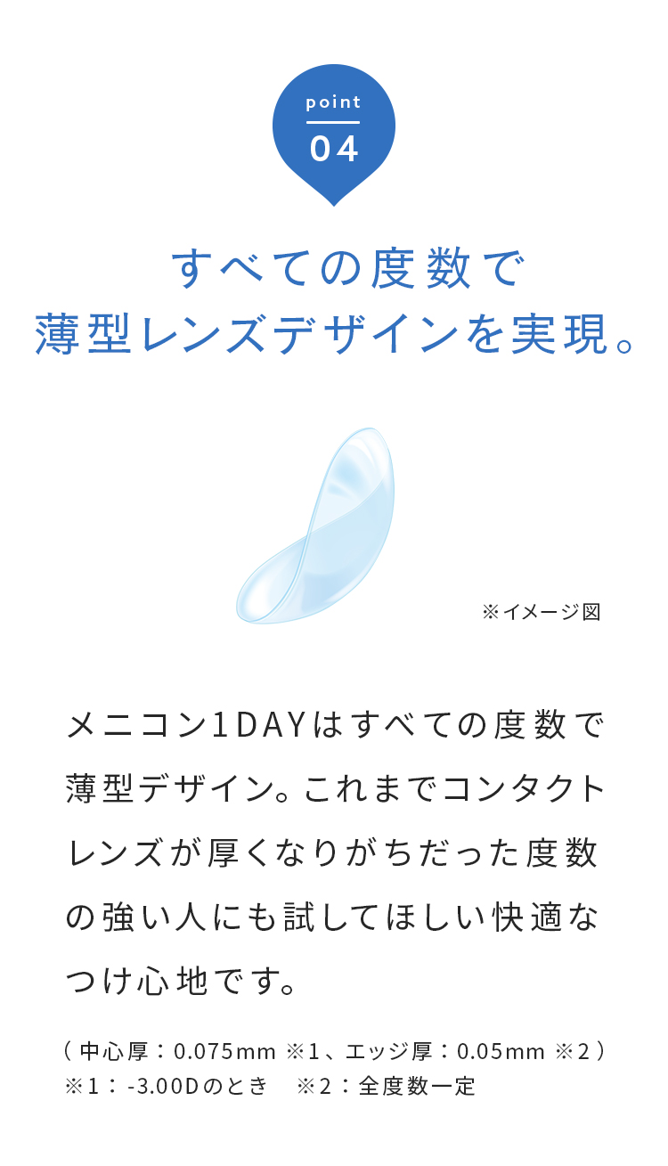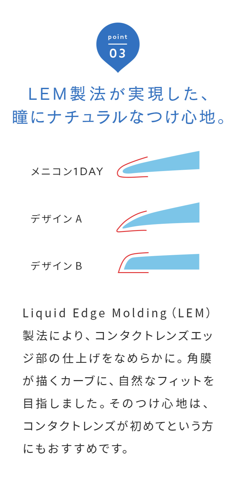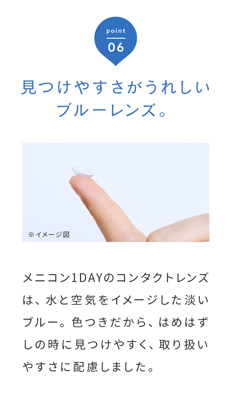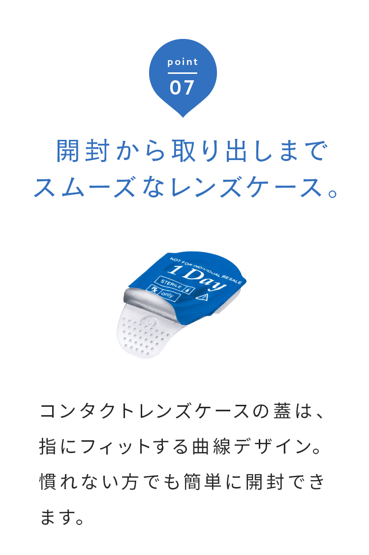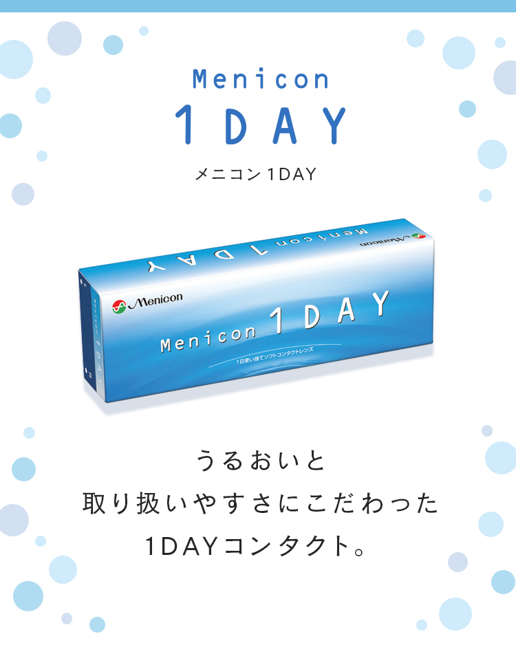 | その他詳細 1 | ■装用期間:1日使い捨て ■装用 :終日装用 ■BC:8.6mm ■DIA:14.2mm ■度数 -0.25~-6.00(0.25刻み) -6.50~-10.00(0.50刻み) ■含水率:55% |