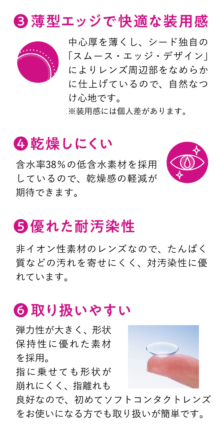 | その他詳細 1 | ■装用期間:1日使い捨て ■装用 :1日使い捨てコンタクトレンズ ■BC:8.7mm ■DIA:14.0mm ■度数 -0.25~-6.00(0.25刻み) -6.50~-12.00(0.50刻み) ■含水率:38% |