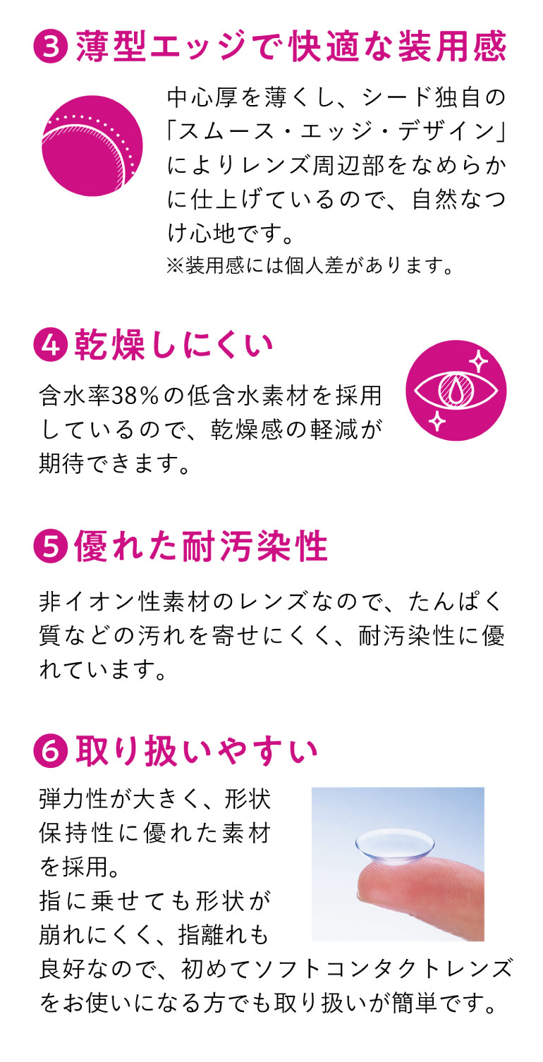 | 注意事項/留意事項 | コンタクトレンズは高度管理医療機器です。取り扱い方法を守り正しくご使用下さい。 |