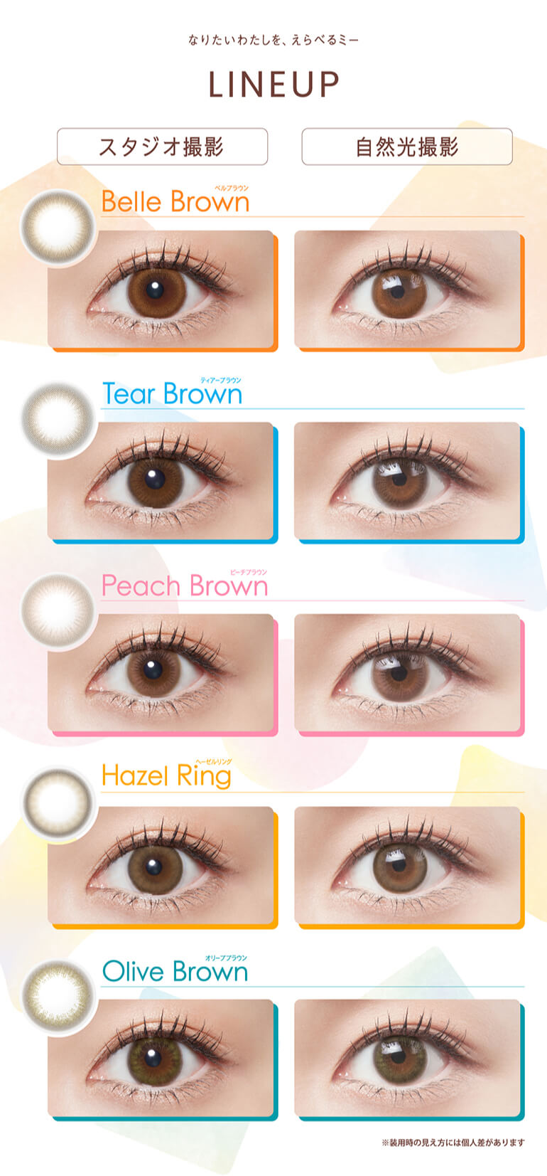 | その他詳細 1 | ■装用期間:1日使い捨て ■装用 :終日装用 ■BC:8.7mm ■DIA:14.2mm ■着色直径:13.6mm:ティアーブラウン、ピーチブラウン、ベルブラウン 13.3mm:オリーブブラウン 13.0mm:ヘーゼルリング ■度数 ±0.00(度なし) -0.25~-6.00(0.25刻み) -6.50~-10.00(0.50刻み) ■含水率:58% |