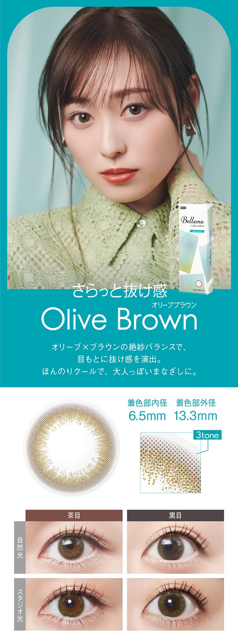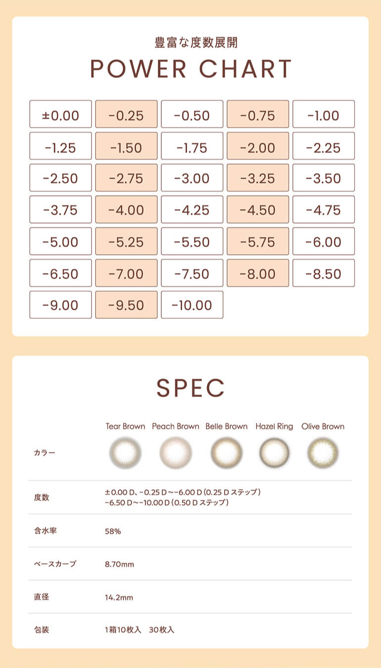 | その他詳細 1 | ■装用期間:1日使い捨て ■装用 :終日装用 ■BC:8.7mm ■DIA:14.2mm ■着色直径:13.6mm:ティアーブラウン、ピーチブラウン、ベルブラウン 13.3mm:オリーブブラウン 13.0mm:ヘーゼルリング ■度数 ±0.00(度なし) -0.25~-6.00(0.25刻み) -6.50~-10.00(0.50刻み) ■含水率:58% |