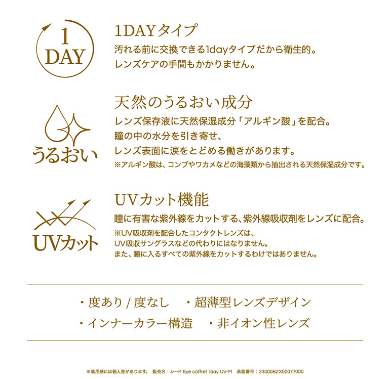 | その他詳細 1 | ■装用期間:1日使い捨て ■装用 :終日装用 ■BC:8.7mm ■DIA ファーストメイク、シアーメイク、スウィーティーメイク:14.2mm ベースメイク、ナチュラルメイク、リッチメイク:14.0mm ■度数 ±0.00(度なし) -0.25~-6.00(0.25刻み) -6.50~-12.00(0.50刻み) +0.25 +0.50~+3.00(0.50刻み) ■着色直径 スウィーティーメイク:13.5mm ファーストメイク:13.3mm リッチメイク:13.2mm シアーメイク:13.1mm ナチュラルメイク:13.0mm ベースメイク:12.8mm ■含水率:38% |