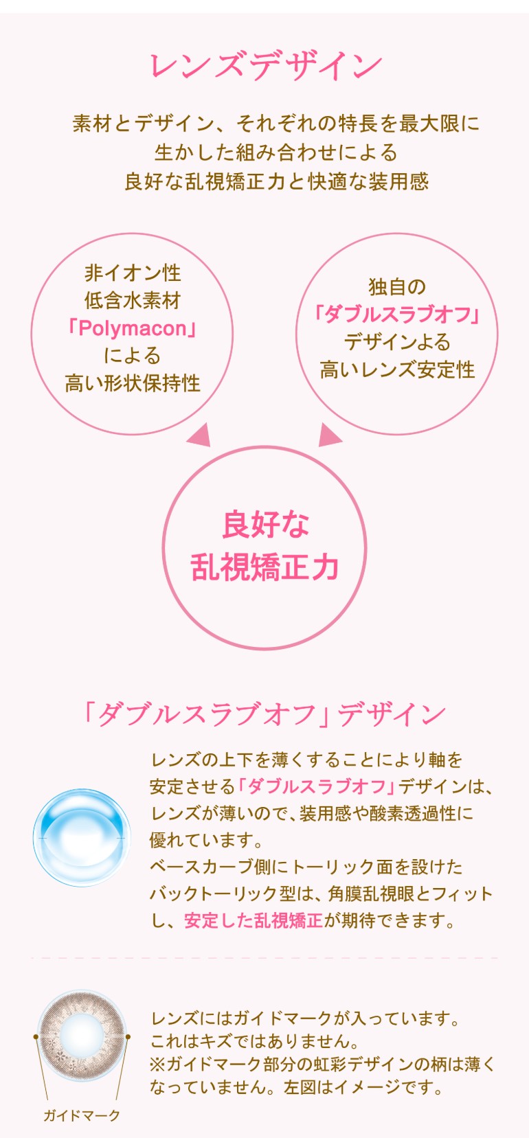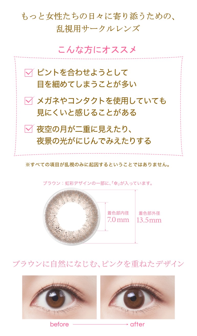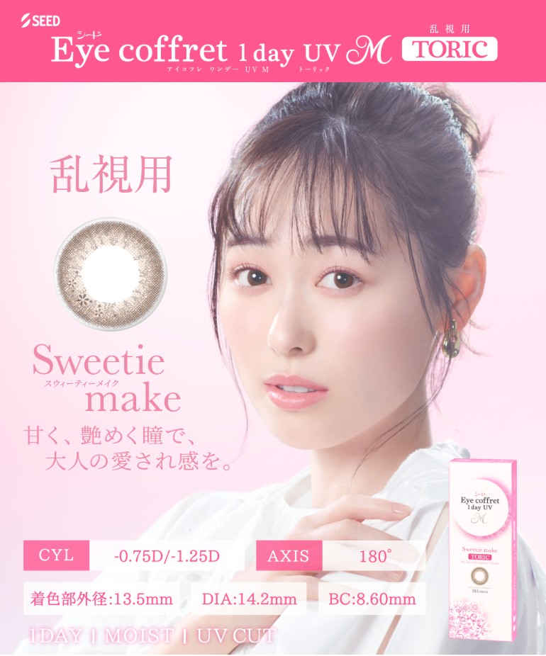| その他詳細 1 | ■装用期間:1日使い捨て ■装用 :終日装用 ■BC:8.6mm ■DIA:14.2mm ■度数 ±0.00(度なし) -0.25~-6.00(0.25刻み) -6.50~-8.00(0.50刻み) ■乱視度数(円柱度数) -0.75、-1.25 ■乱視軸(円柱軸度) 180° ■着色直径 リッチメイク:13.2mm スウィーティーメイク:13.5mm ■含水率:38% |
