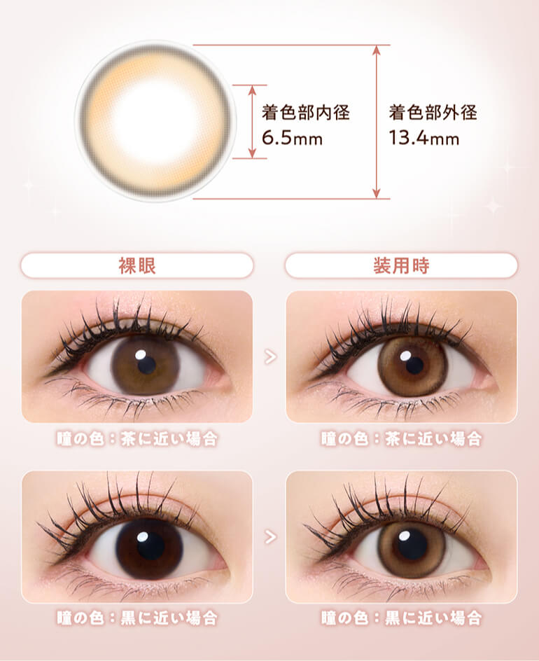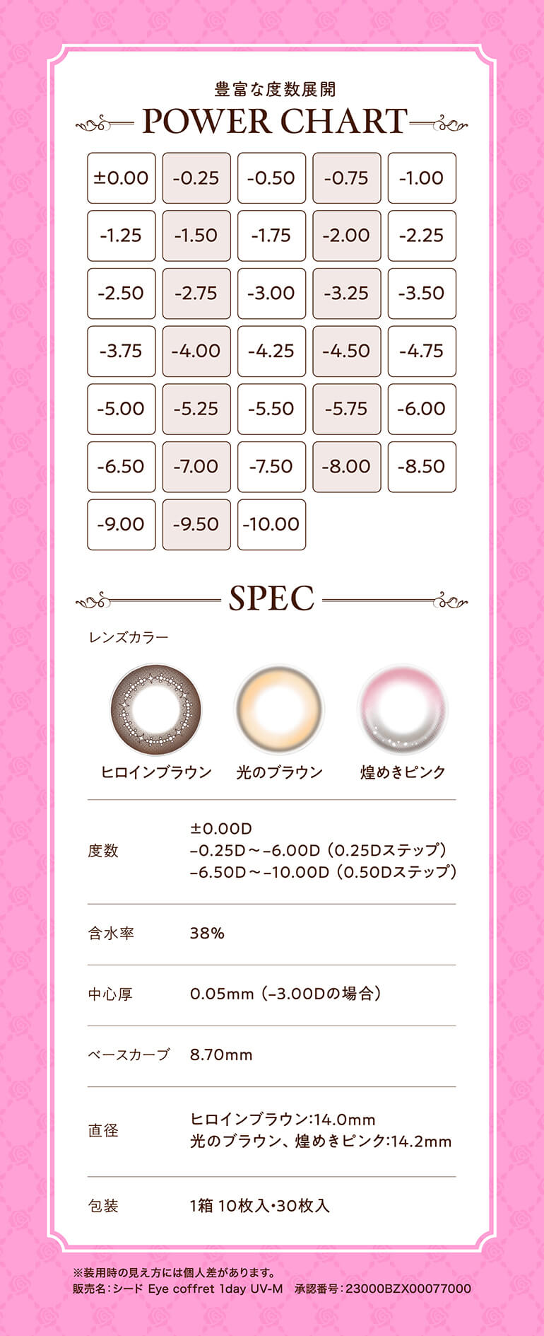 | その他詳細 1 | ■装用期間:1日使い捨て ■装用 :終日装用 ■BC:8.7mm ■DIA:ヒロインブラウン:14.0mm 光のブラウン、煌めきピンク:14.2mm ■着色直径:光のブラウン、ヒロインブラウン:13.4mm 煌めきピンク:13.6mm ■度数 ±0.00(度なし) -0.25~-6.00(0.25刻み) -6.50~-10.00(0.50刻み) ■含水率:38% |