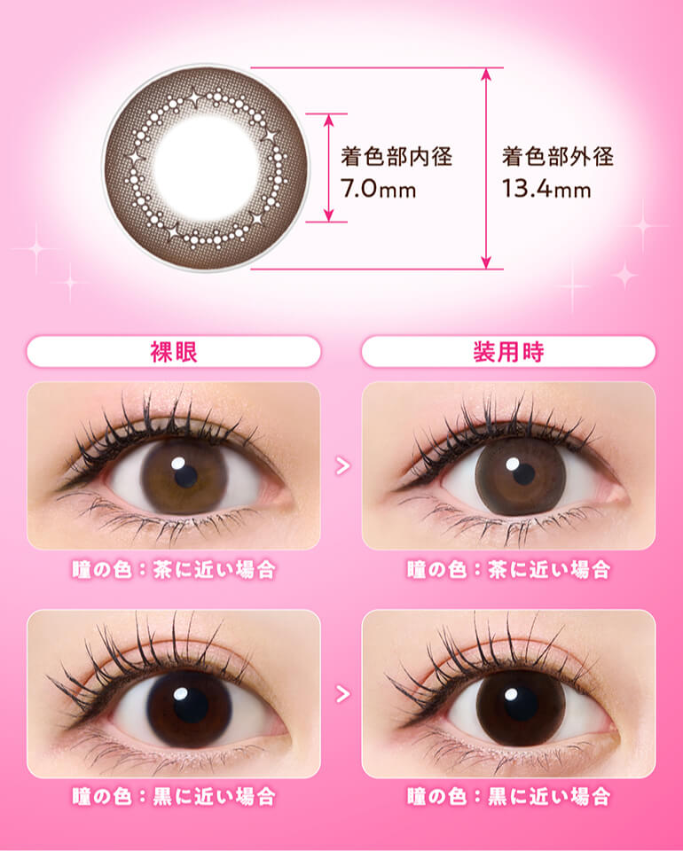 | その他詳細 1 | ■装用期間:1日使い捨て ■装用 :終日装用 ■BC:8.7mm ■DIA:ヒロインブラウン:14.0mm 光のブラウン、煌めきピンク:14.2mm ■着色直径:光のブラウン、ヒロインブラウン:13.4mm 煌めきピンク:13.6mm ■度数 ±0.00(度なし) -0.25~-6.00(0.25刻み) -6.50~-10.00(0.50刻み) ■含水率:38% |