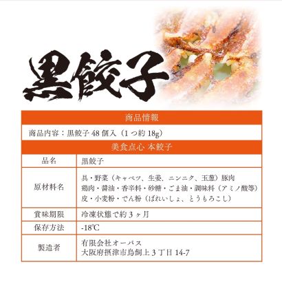 | 内容量 | 約1728g(海老餃子1個あたり 約18g、黒餃子1個あたり 18g) |