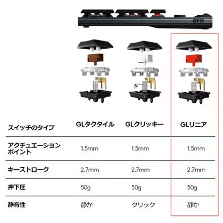 キースイッチ:メカニカル(GLLinear)[耐久性]5000万回の打鍵[アクチュエーションポイント]1.5mm[押下圧]50g[キーストローク]2.7mm