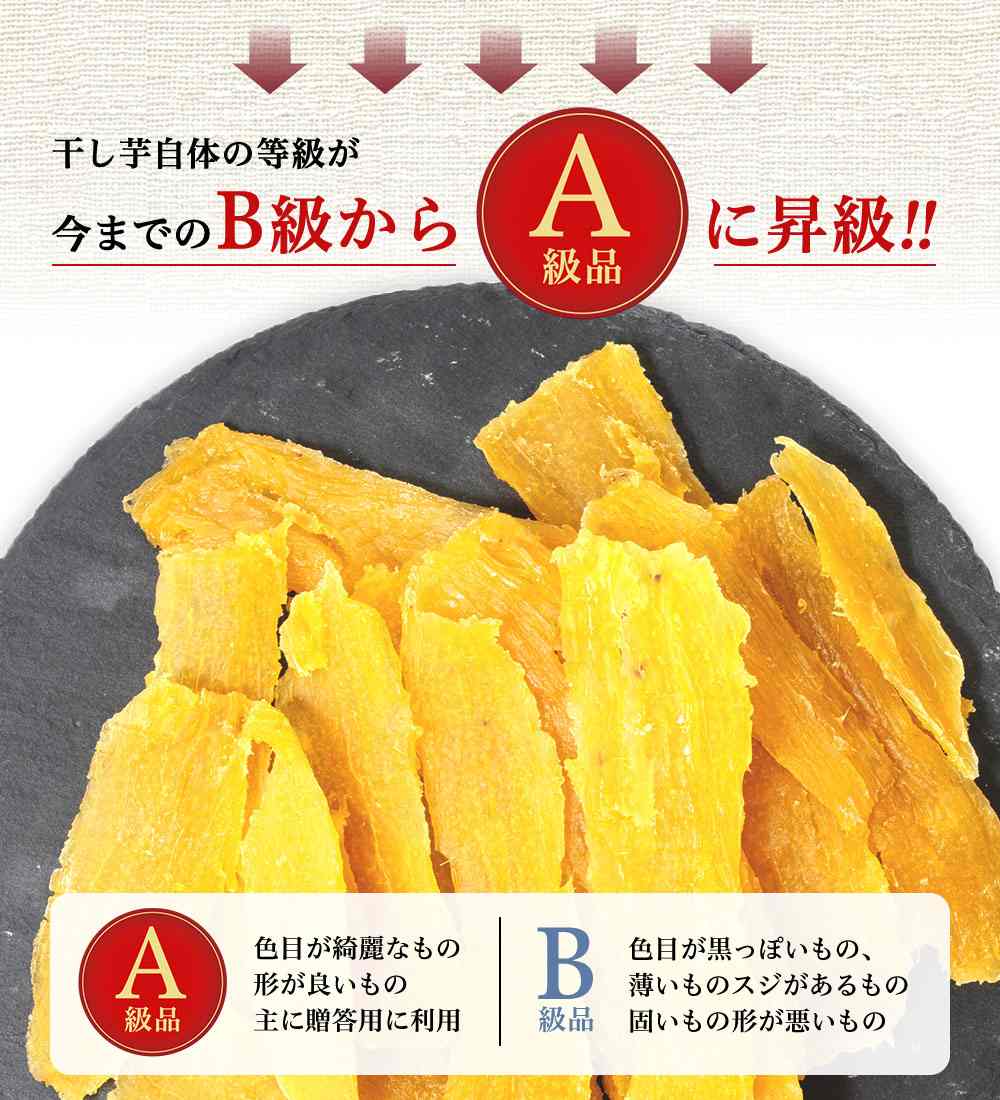 ほしいもの表面に白い粉が発生することがありますが、糖分が結晶化したものです。 また、表面にいもの皮やひげの根の付着、繊維や黒ずみがみられることがありますが、いずれも品質には問題ございませんので、安心してお召し上がり下さい。 筋があったり、硬い、色が悪い、甘みが足りないなど正規品にならなかった訳あり品になりますが、品質に問題ございませんので、安心してお召し上がりください。 ほしいもが重なった状態など、見た目・梱包に偏りがある場合がございます。ご家庭用としてお楽しみください。 |