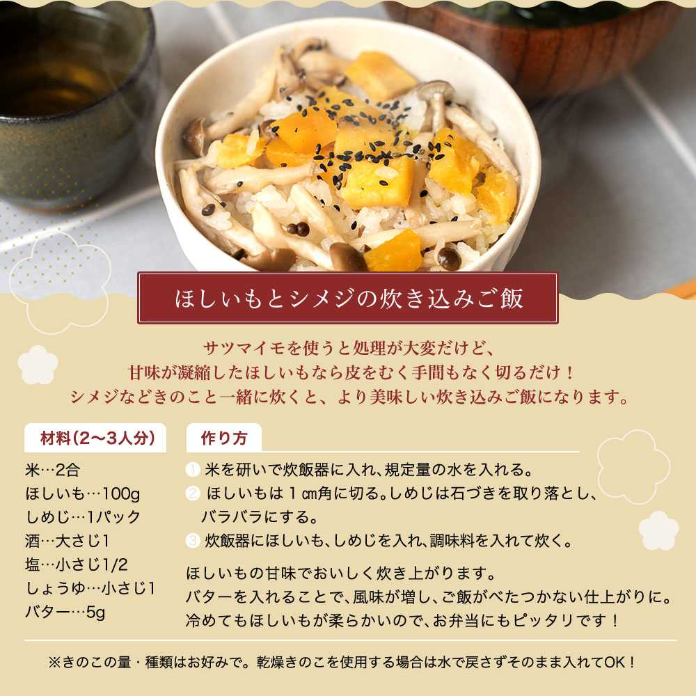 | 注意事項/留意事項 | 開封後は、お早めにお召し上がり下さい。 ほしいもの表面に白い粉が発生することがありますが、糖分が結晶化したものです。 また、表面にいもの皮やひげの根の付着、繊維や黒ずみがみられることがありますが、いずれも品質には問題ございませんので、安心してお召し上がり下さい。 筋があったり、硬い、色が悪い、甘みが足りないなど正規品にならなかった訳あり品になりますが、品質に問題ございませんので、安心してお召し上がりください。 ほしいもが重なった状態など、見た目・梱包に偏りがある場合がございます。ご家庭用としてお楽しみください。 |