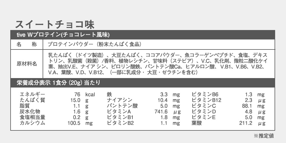 | 注意事項/留意事項 | ・専用シェイカーは付属しておりません。シェイカーはご自身でご準備ください。 ・計量スプーンはプロテイン購入数量分、付属しております。 ・お湯や温めた牛乳を入れてシェイクしないでください。蒸気 や中身がふき出し、やけどの原因となります。 ・薬を服用中あるいは通院中の方は、必ず医師に相談の上、 召し上がりください。 ・お子様の手の届かないところに保管してください。 ・製品中に原料由来の粒が目立つ場合がありますが、品質 には問題ありません。 ・開封後は吸湿しやすい為、またホコリや髪の毛が入らない よう、チャックをしっかりと閉じて保管し、賞味期限に関わら ずお早めに召し上がりください。 |