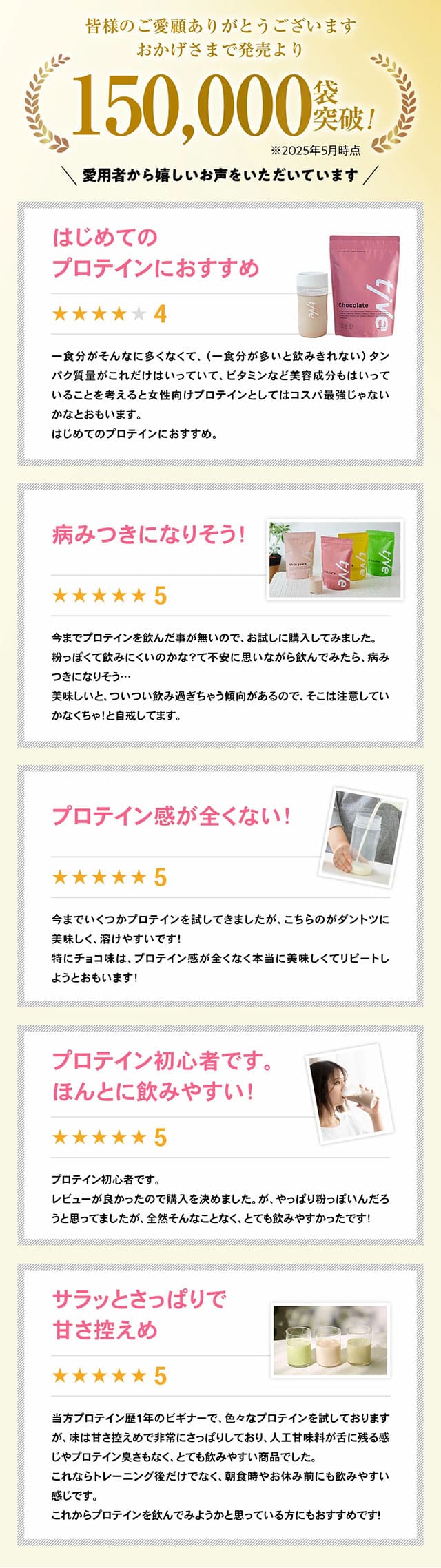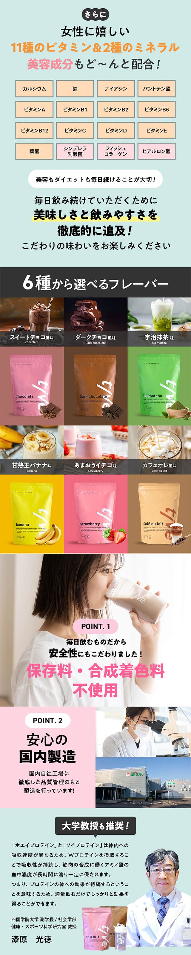 | 注意事項/留意事項 | ・専用シェイカーは付属しておりません。シェイカーはご自身でご準備ください。 ・計量スプーンはプロテイン購入数量分、付属しております。 ・お湯や温めた牛乳を入れてシェイクしないでください。蒸気 や中身がふき出し、やけどの原因となります。 ・薬を服用中あるいは通院中の方は、必ず医師に相談の上、 召し上がりください。 ・お子様の手の届かないところに保管してください。 ・製品中に原料由来の粒が目立つ場合がありますが、品質 には問題ありません。 ・開封後は吸湿しやすい為、またホコリや髪の毛が入らない よう、チャックをしっかりと閉じて保管し、賞味期限に関わら ずお早めに召し上がりください。 |