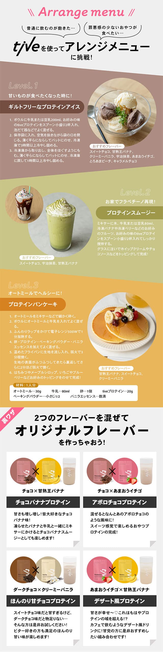| その他詳細 1 | 【召し上がり方】 シェイカーに牛乳や豆乳を200ml入れ、本品を20g入れてしっかりシェイクして召し上がりください。 粉末20gは、付属スプーンで小盛り2杯、大さじですりきり4杯が目安です。量はお好みで調節してください。 水の場合は150mlを目安に溶かしてください。 ※牛乳や豆乳の量はお好みにより調整してください。 ※溶かした後は速やかにお飲みください。粉末のまま口に入れると喉に詰まる恐れがありますので、必ず溶かしてから召し上がりください。 【オススメの飲むタイミング】 ●朝食に! 朝の忙しい時間に簡単に作れて便利!プロテインを毎日の習慣にするなら朝食の置き換えがオススメです。プロテインで1日の活動スイッチをオン! ●運動後に! 運動で壊れた筋肉の修復には「トレーニングの45分後」に飲むのがオススメ! |