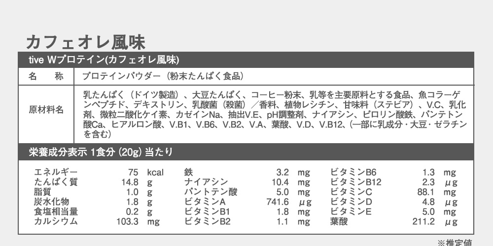 健康な成人の場合、悪影響のない1日のカフェイン摂取量は「400mgまで」、妊娠中の方は「200mgまで」と推奨されています。tiveプロテインカフェオレ風味にはカフェインを多く含む原材料が使用されておりますので、妊娠中、授乳中の方は、自身の体調を考慮し、過剰摂取にならないようお気をつけください。