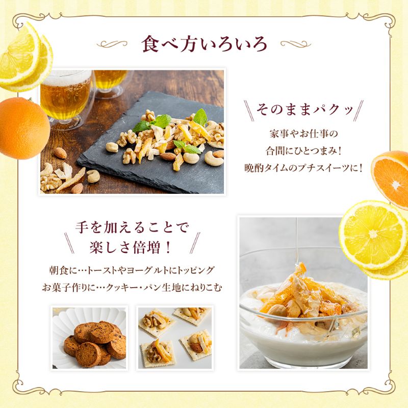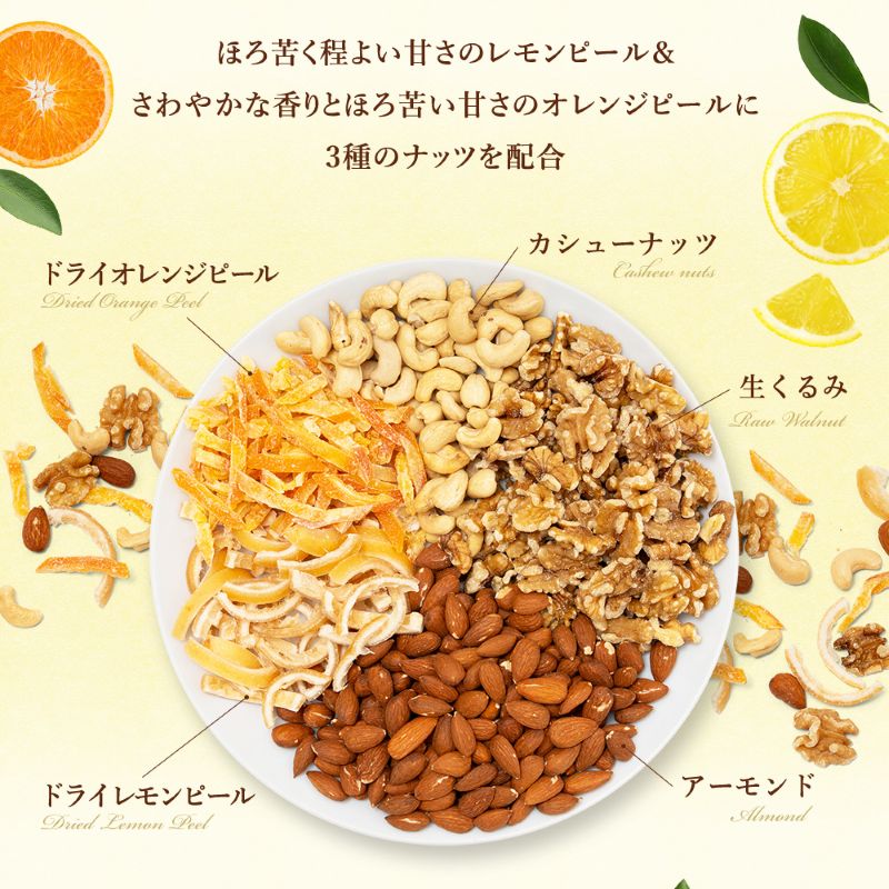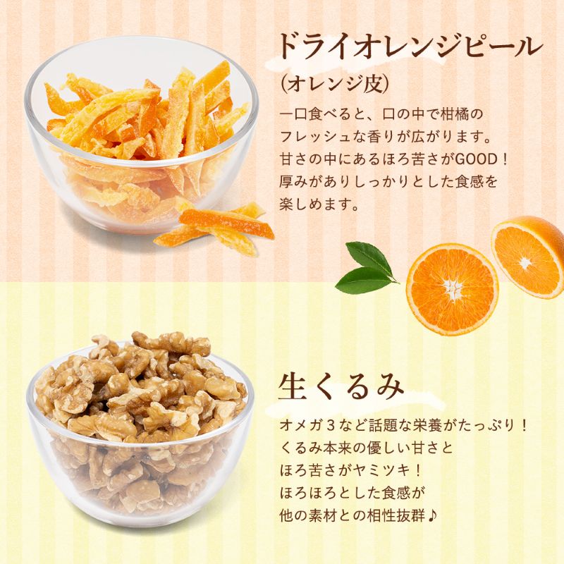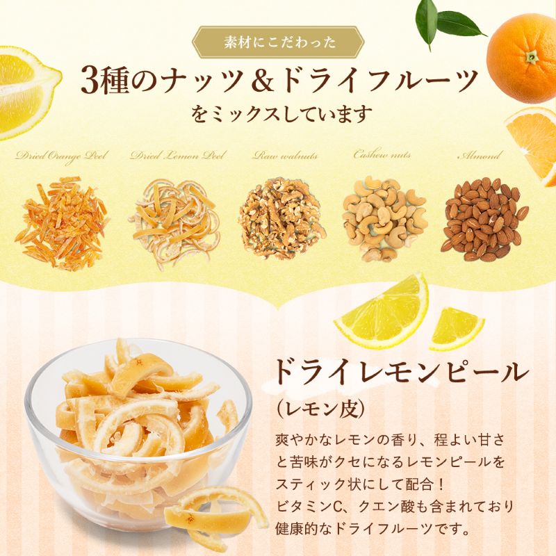| 原材料/素材/材質 | アーモンド(アメリカ)、くるみ、カシューナッツ、ドライオレンジピール(オレンジ皮、砂糖)、ドライレモンピール(レモン皮、砂糖)/酸味料、保存料(亜硫酸塩) |