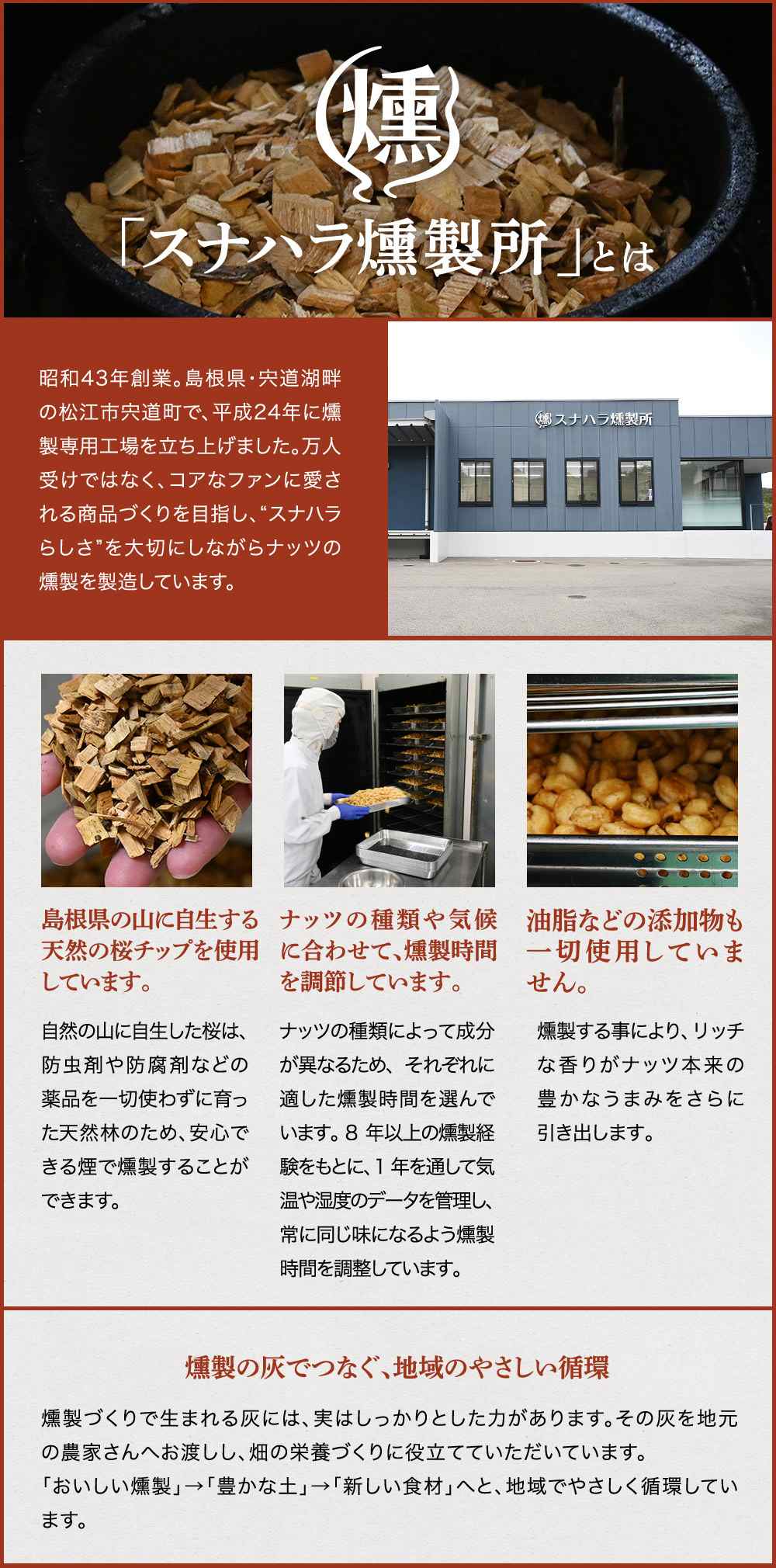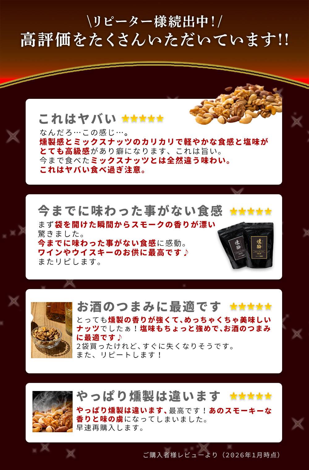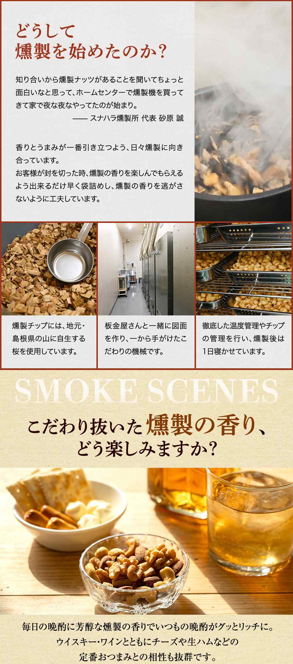 | 原材料/素材/材質 | 燻製ピーナッツ(落花生(アメリカ)、植物油、食塩)、燻製アーモンド(アーモンド、植物油、食塩)、燻製カシューナッツ(カシューナッツ、植物油、食塩)、燻製ジャイアントコーン(ジャイアントコーン、植物油、食塩、胡椒)、食塩/調味料(アミノ酸等) |