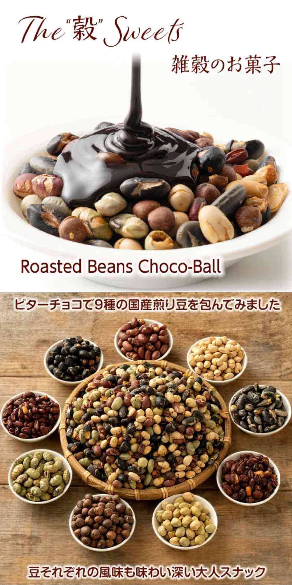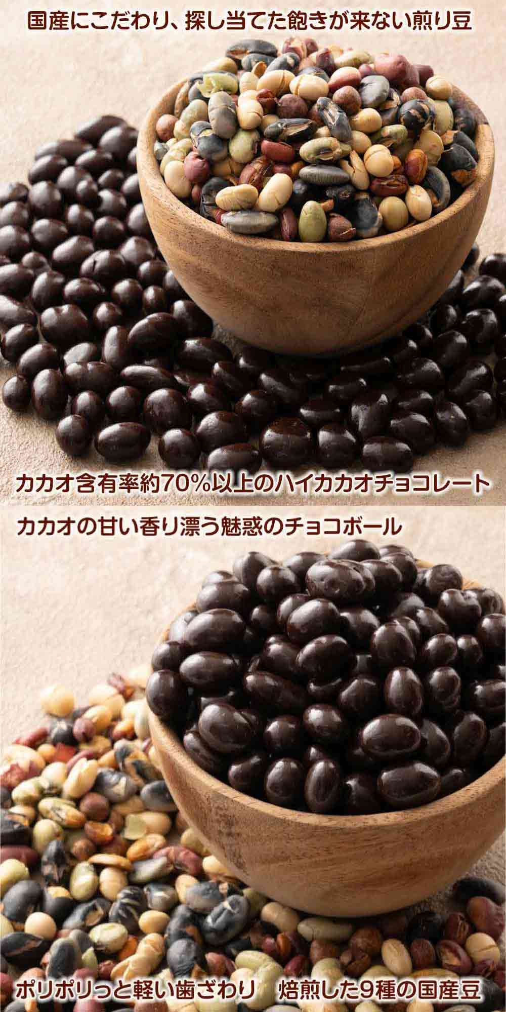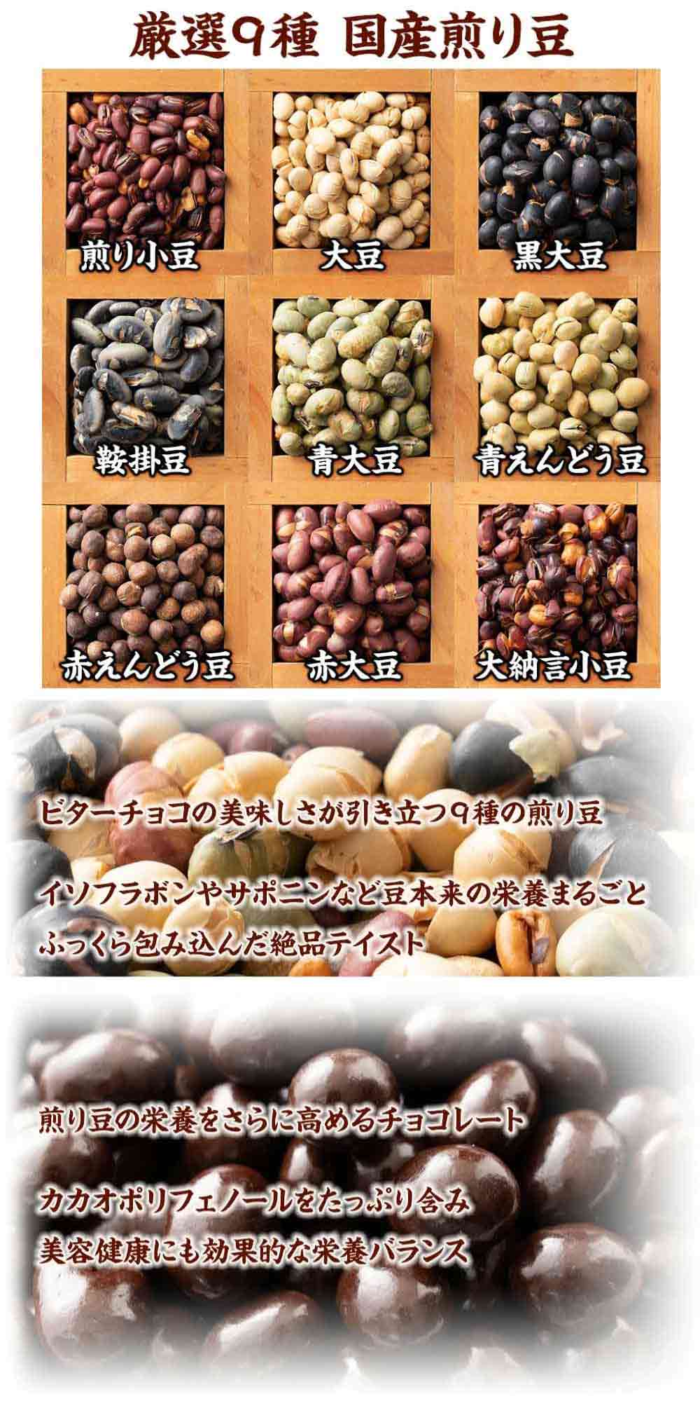 | 原材料/素材/材質 | チョコレート[国内製造(カカオマス、砂糖、ココアバター、その他)]、国産煎り豆ミックス(黄大豆、青大豆、小豆、黒大豆、鞍掛け豆、赤えんどう豆、赤大豆、大納言小豆、青えんどう豆)、でん粉分解物/光沢剤、乳化剤、香料、(一部に乳成分・大豆を含む) |