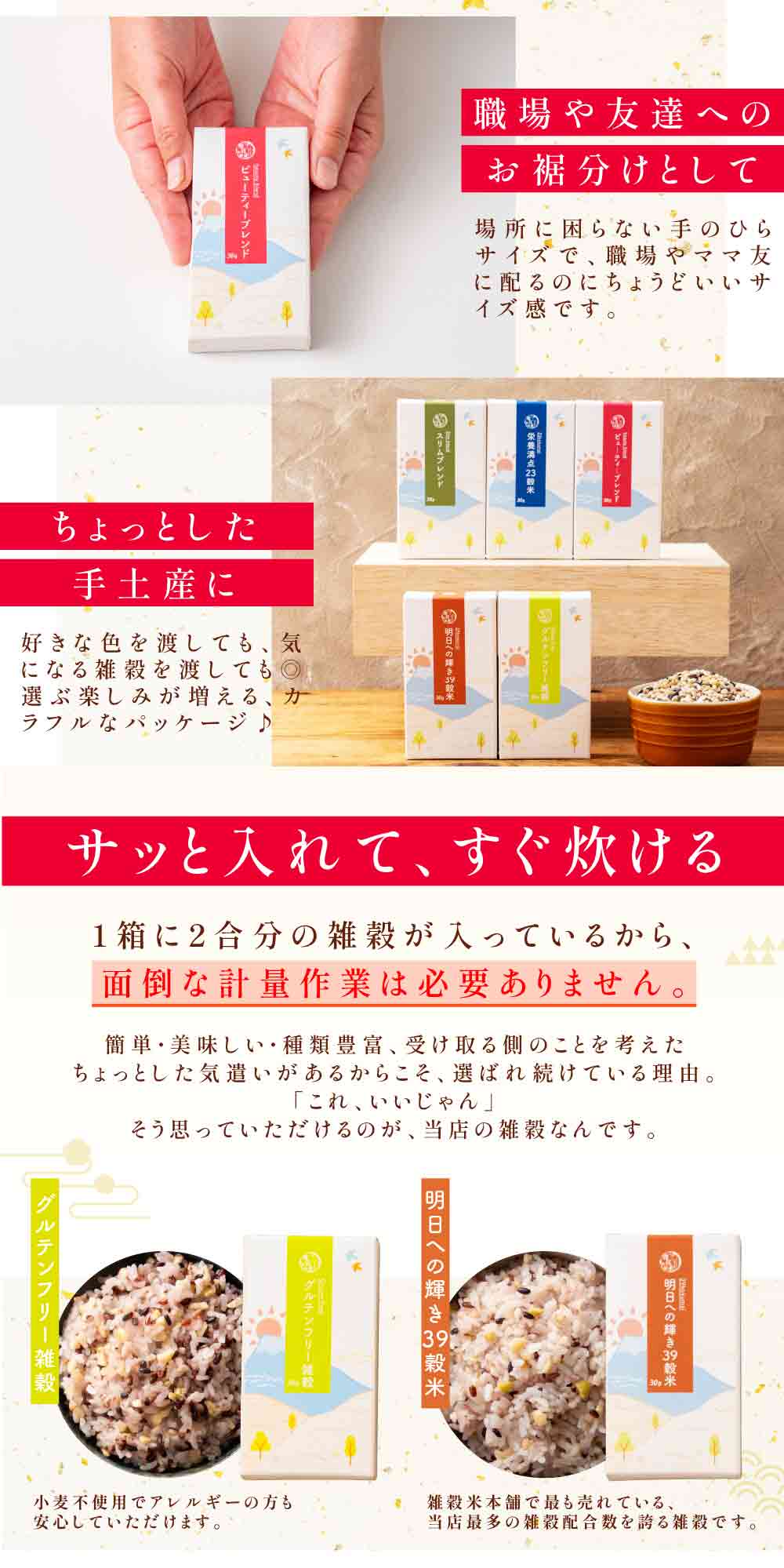 | その他詳細 1 | 【グルテンフリーブレンド】 黒米、大豆、もち米、赤米、発芽玄米、青大豆、緑米、小豆、きび、黒大豆、ひえ、高きび、とうもろこし、あわ、アマランサス、白胡麻、黒胡麻、金胡麻、(一部に大豆・ごまを含む) 【39穀米】 丸麦、黒米、大豆、押麦、もち麦、もち精白米、はだか麦、胚芽押麦、青大豆、米粒麦、若玄米、巨大胚芽米、もち玄米、発芽玄米、赤米、白もち麦、緑米、きび、小豆、焙煎玄米、胚芽精白米、ひえ、はと麦、高きび、とうもろこし、黒大豆、黒焼き玄米、秘伝豆、発芽赤米、発芽緑米、発芽黒米、大豆胚芽、白えごま、黒えごま、アマランサス、あわ、黒胡麻、白胡麻、金胡麻、(一部に大豆・ごまを含む) |