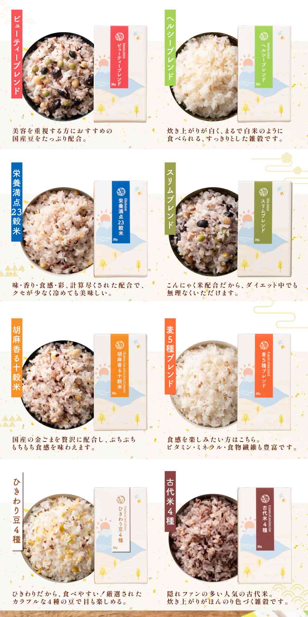 | その他詳細 3 | 【スリムブレンド】 丸麦、大豆、黒大豆、緑米、青大豆、こんにゃく米、小豆、もちきび、とうもろこし、ひえ、もちあわ、アマランサス/貝カルシウム、ビタミンC、(一部に大豆を含む) 【胡麻香る十雑穀】 丸麦、黒米、胚芽押麦、大豆、はだか麦、もち麦、きび、ひえ、はと麦、あわ、白胡麻、黒胡麻、金胡麻、(一部にごまを含む) 【麦5種ブレンド】 丸麦、胚芽押麦、もち麦、はだか麦、はと麦 【ひきわり豆4種ブレンド】 大豆、黒大 【古代米4種ブレンド】 黒米、赤米、緑米、発芽玄米 |