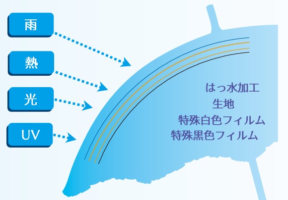 耐水圧20,000mm以上、遮光率100%、紫外線遮蔽率100%で、雨、風、日差しに対応します。