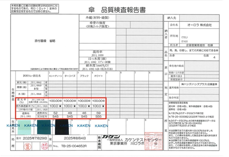 試験方法:[遮光率]JIS L 1055A法 [UV遮蔽率]JIS L 1925
