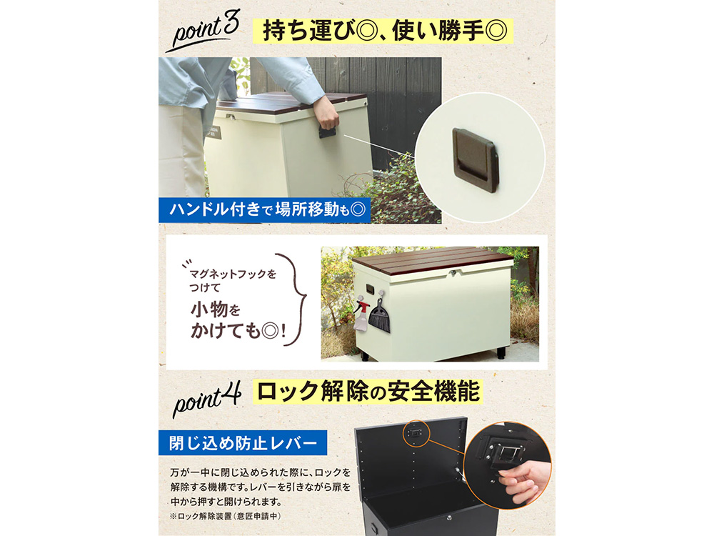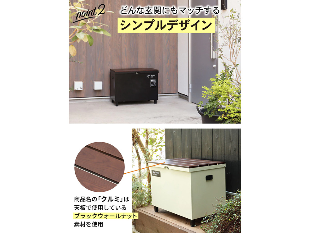 宅配ボックス、ベンチ、収納ボックスなどいろいろな使い方ができる便利なアイテムです。