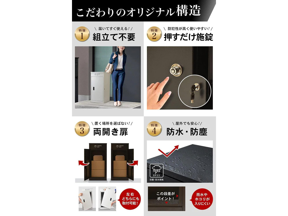 | その他詳細 4 | 付属品:固定用アンカー×4、上扉固定用ネジ×1、六角レンチ×1、鍵交換用レンチ×2、シリンダープッシュ錠用鍵×2、底板の穴用蓋×1、配達員様向け案内ステッカー×1、配達員様向けマグネット式プレート×1、荷物を衝撃から保護するプロテクトクッション×1、取扱説明書/保証書×1 |