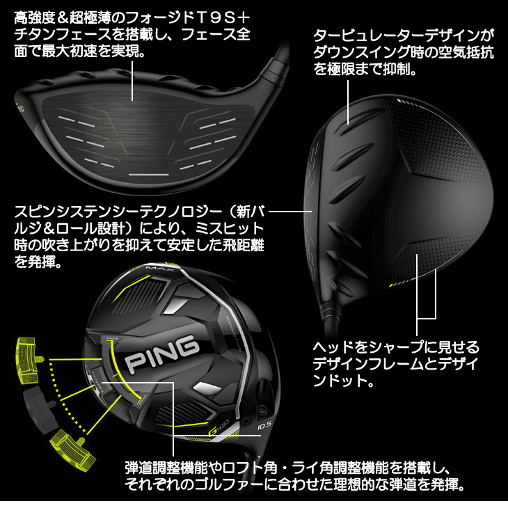 前モデル(G425シリーズ)に引き続いて弾道調整機能やロフト角・ライ角調整機能も搭載されており、それぞれのゴルファーに合わせた理想的な弾道を発揮します。
